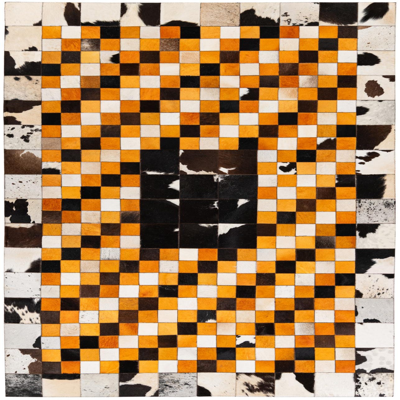 A 5x8 rectangular Cowhide Stocks rug featuring a modern checkerboard pattern in black, white, and orange, with a multi-colored cowhide border.