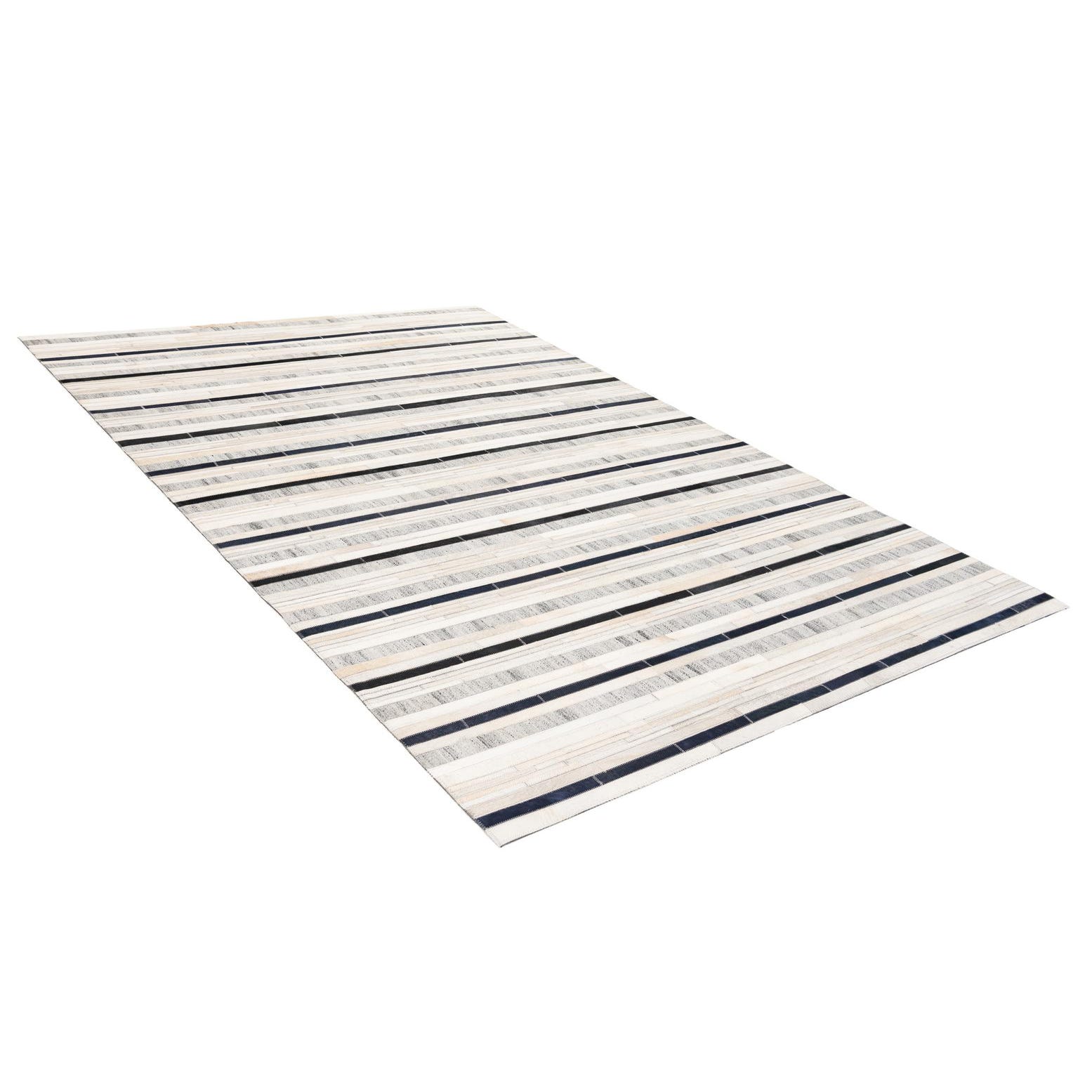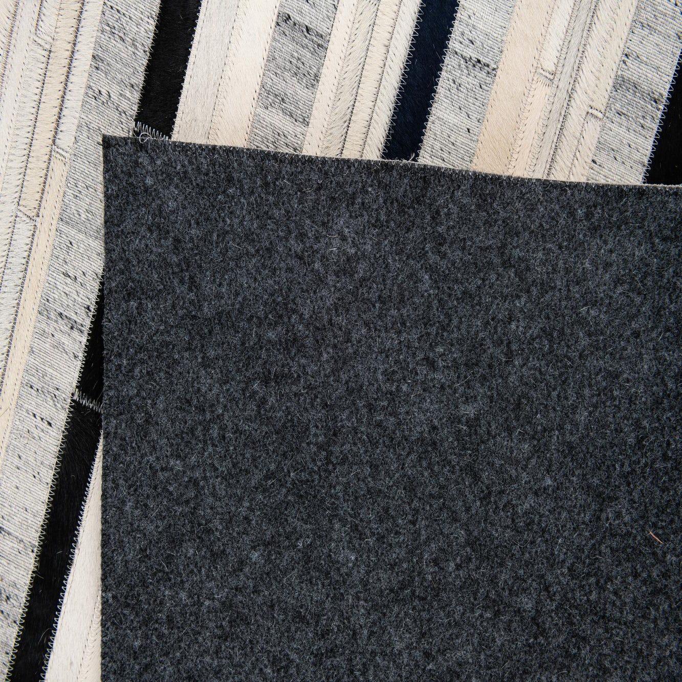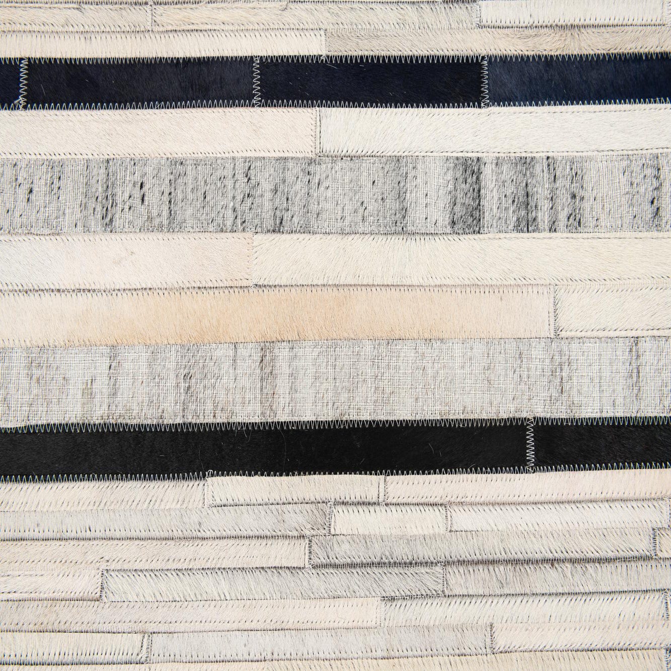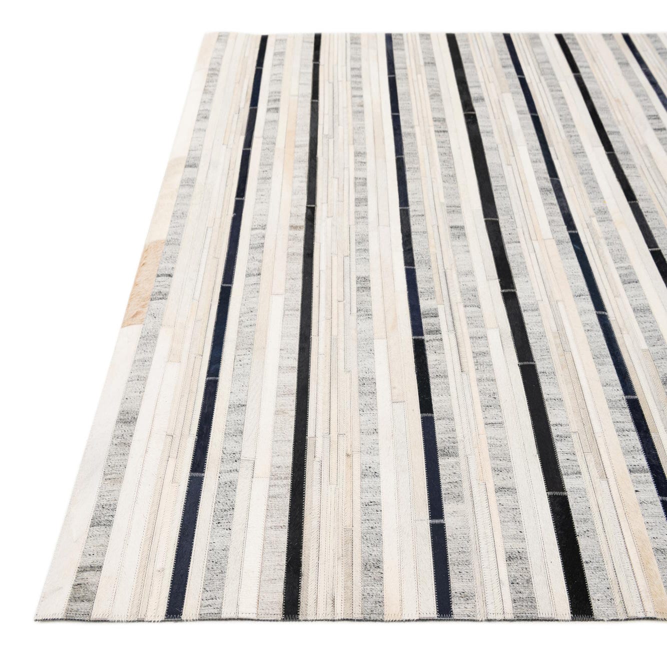 A modern linear design built from hand-cut strips of cowhide and leather, this rug presents a layered stripe pattern with subtle variation in width and tone. The multi background carries bands of beige, ivory, gray and bold black that create clean horizontal movement across the surface. Each strip is hand-stitched into a low-profile patchwork so the surface shows gentle seams and a mix of smooth leather and hair-on-hide textures that invite touch.