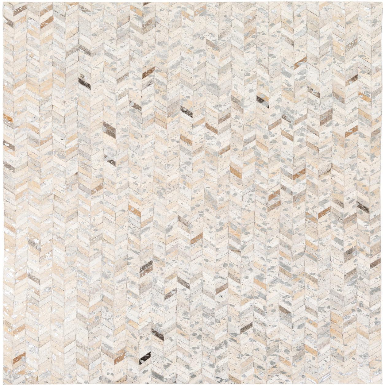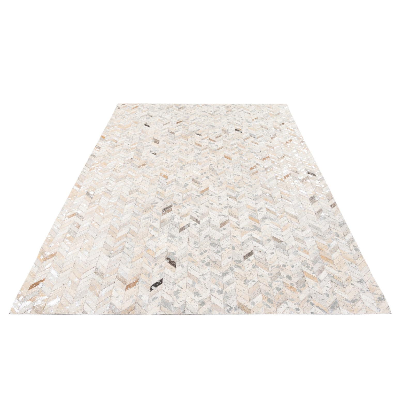 A 5x8 rectangular Cowhide Stocks rug from Rugs.com, featuring a modern chevron pattern in multi-colored natural cowhide and leather, ideal for a living room.