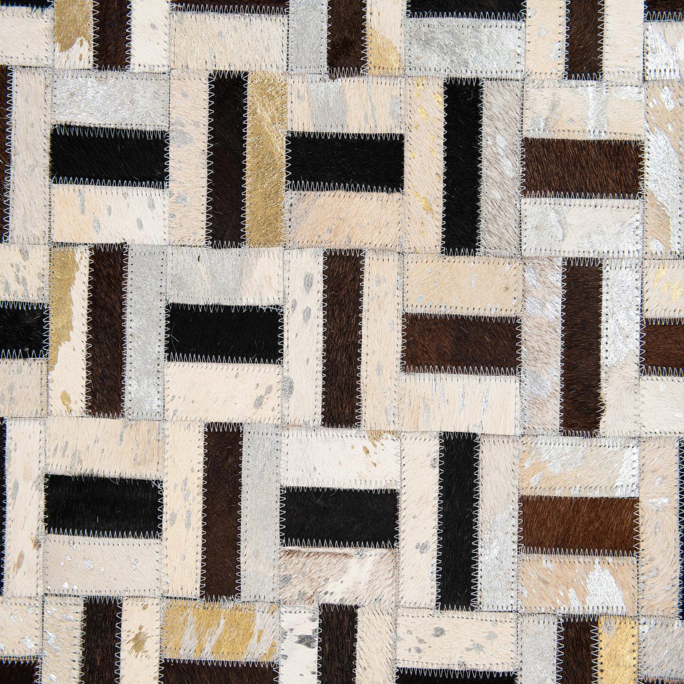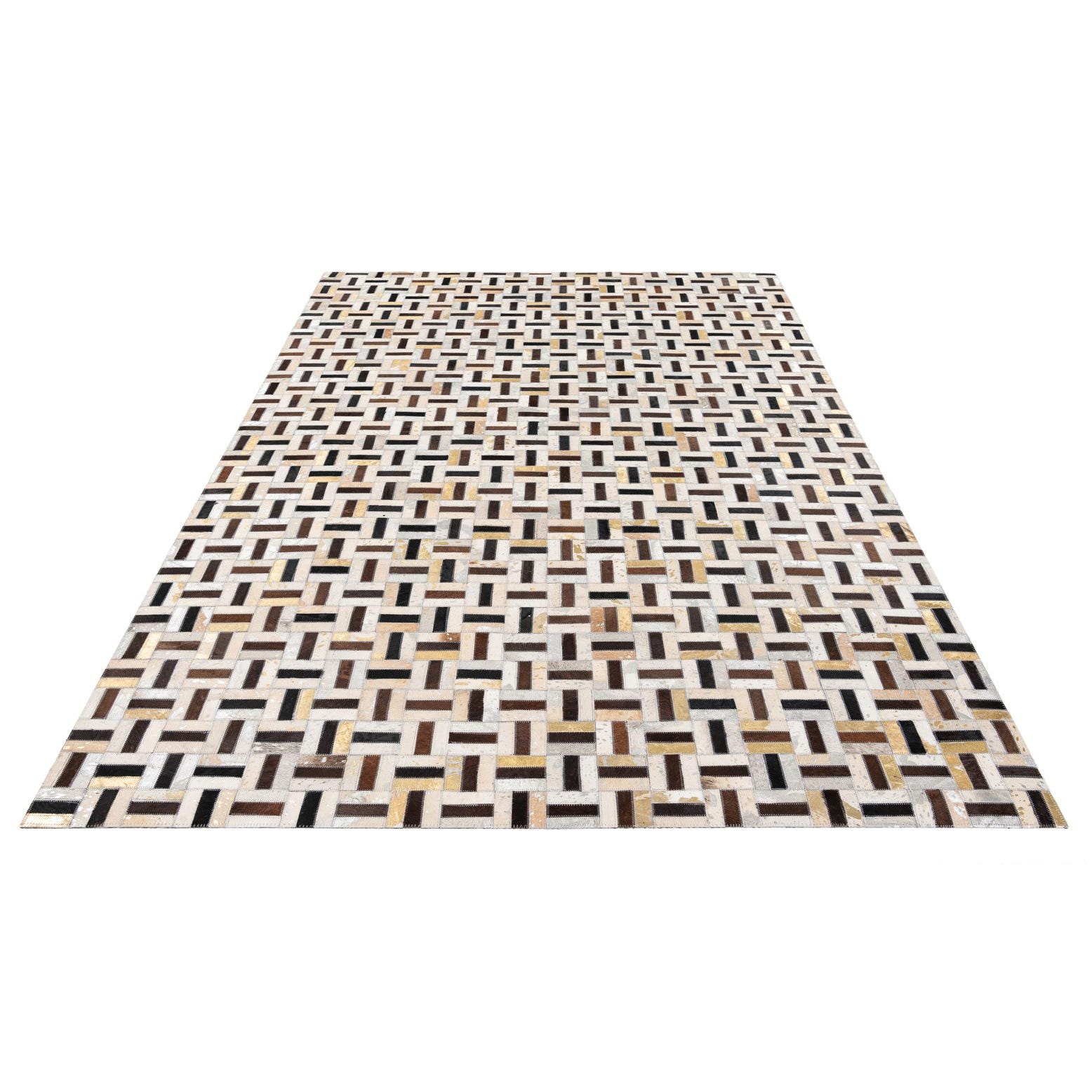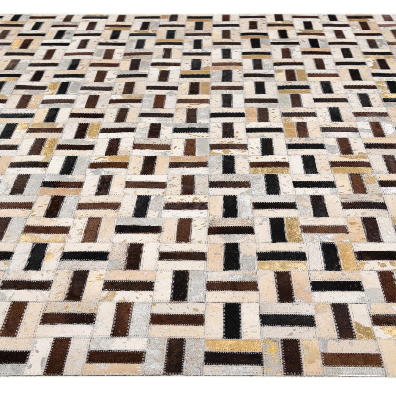 A rectangular 5x8 modern cowhide rug featuring a multi-colored geometric basketweave pattern in brown, black, and cream tones.