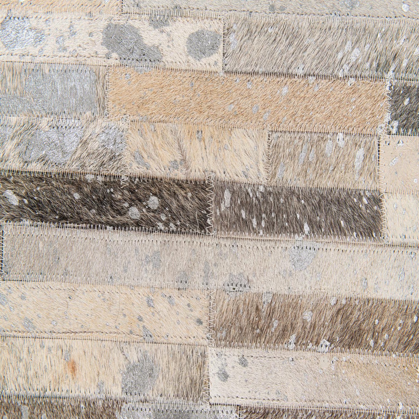 A rectangular 5x8 modern rug made from multi-colored cowhide and leather strips, perfect for a living room.