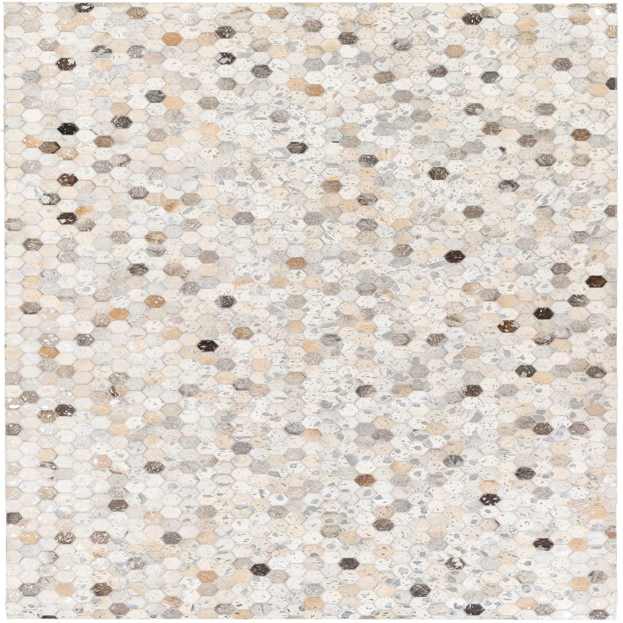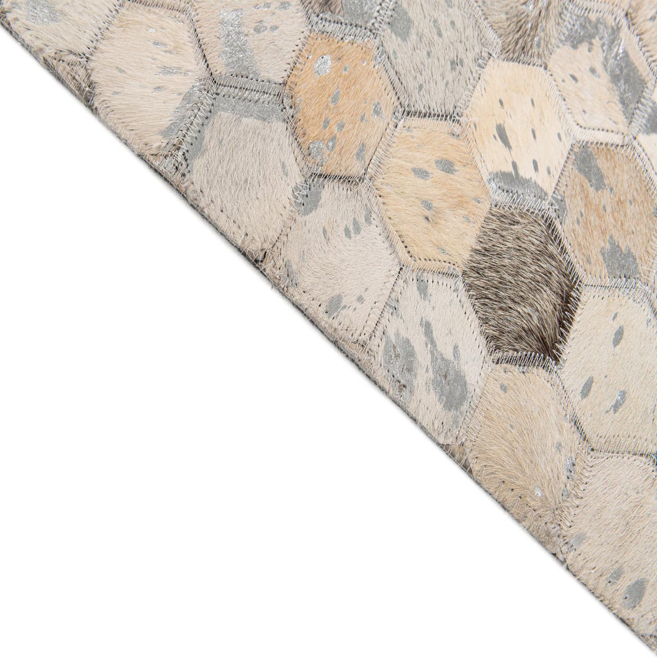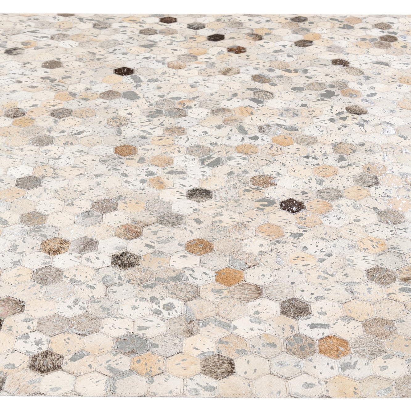 A 5x8 rectangular Cowhide Stocks rug featuring a modern multi-colored hexagonal pattern in shades of brown, grey, and cream.