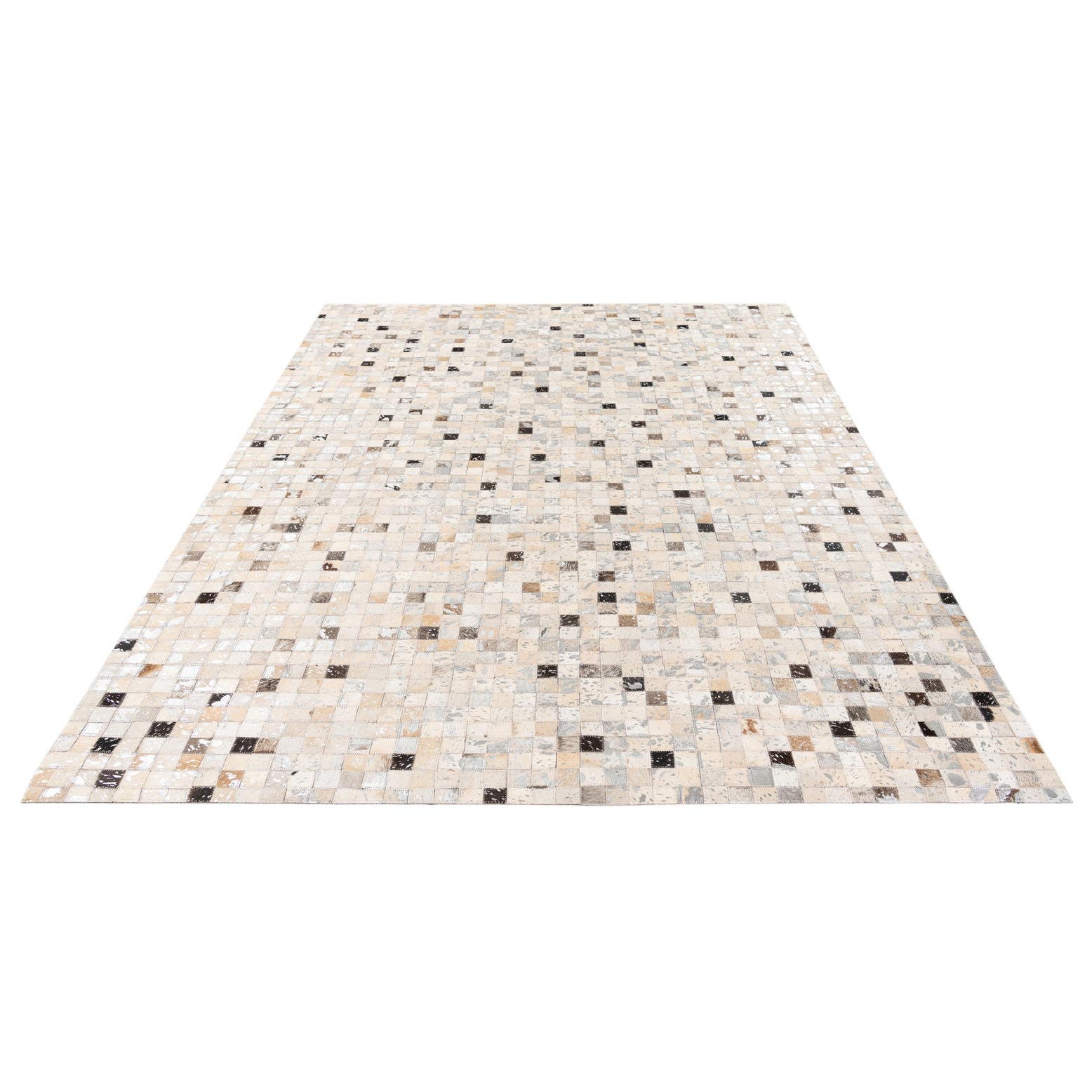 A 5x8 rectangular Cowhide Stocks rug by Rugs.com, featuring a modern patchwork of multi-colored cowhide squares in neutral tones with scattered dark accents.