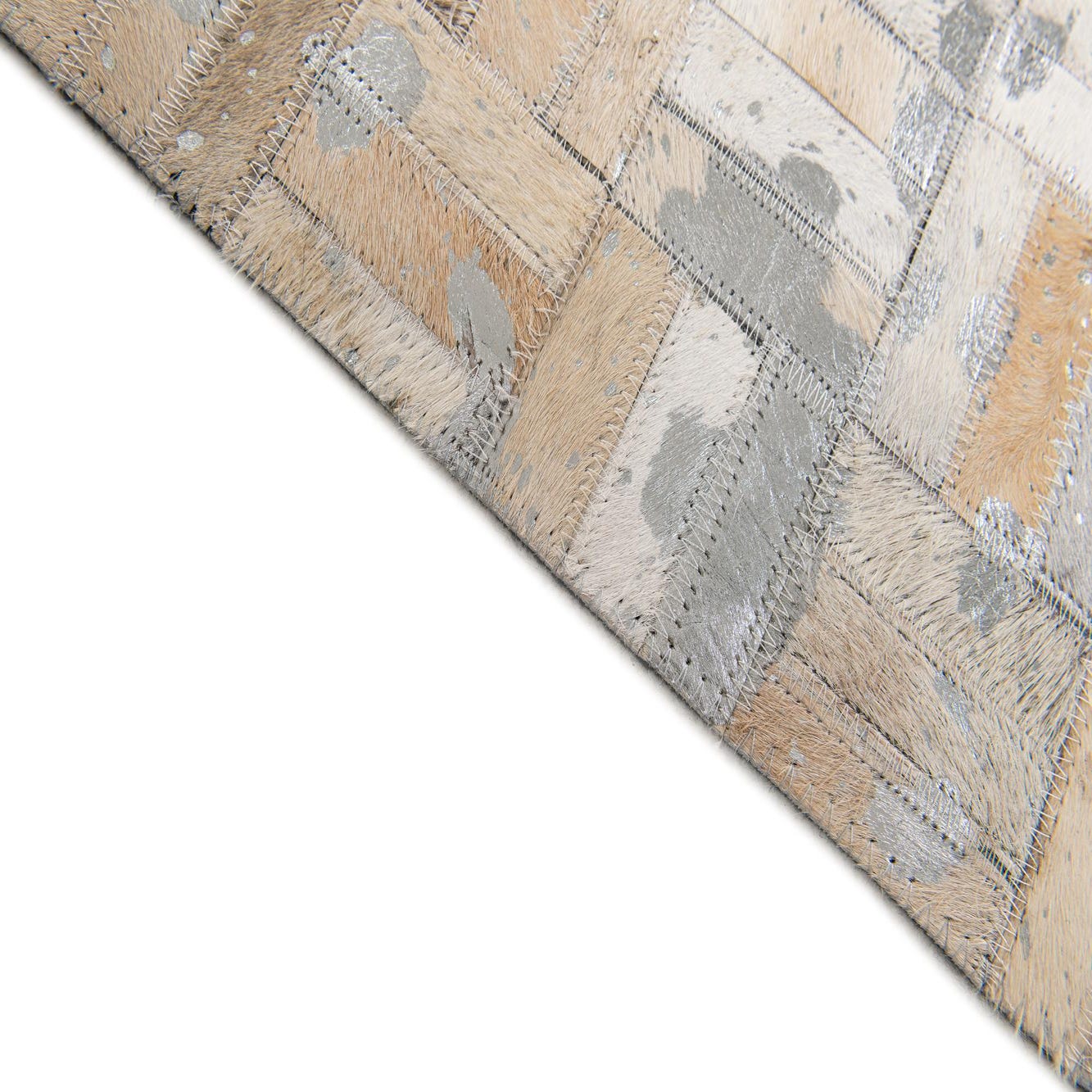 The texture combines short hair-on-hide softness with the firmer, smooth feel of stitched leather seams, offering a tactile mix that is pleasant underfoot and visually layered. Place it to anchor a seating area beneath a low-profile sofa and coffee table, layer it over a larger natural-fiber mat for added interest in an entry or sunroom, or use it to warm a modern farmhouse or contemporary rustic living space. It also complements neutral, wood- or leather-focused furnishings and pairs well with Scandinavian or industrial accents.