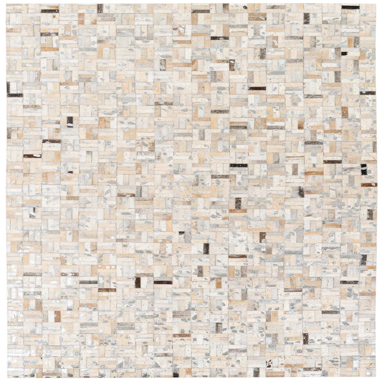 Handmade from cowhide and leather, this piece presents a refined patchwork pattern composed of small rectangular panels arranged in a subtle basketweave motif. The background is multi-toned, with a palette of beige, tan, light brown and brown punctuated by black accents and cool silver-toned highlights. The result is an understated, geometric surface with organic variation in each patch—natural markings and slight tonal shifts create visual depth without a busy overall effect.