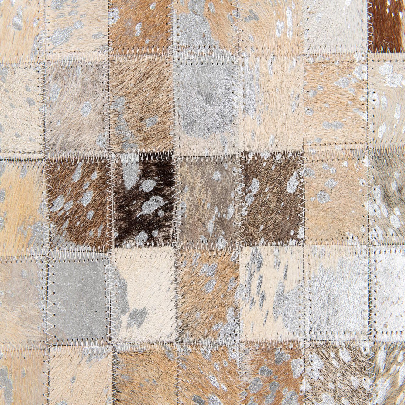 A 5x8 rectangular Cowhide Stocks rug from Rugs.com, featuring a modern patchwork of multi-colored cowhide and leather squares in natural tones.