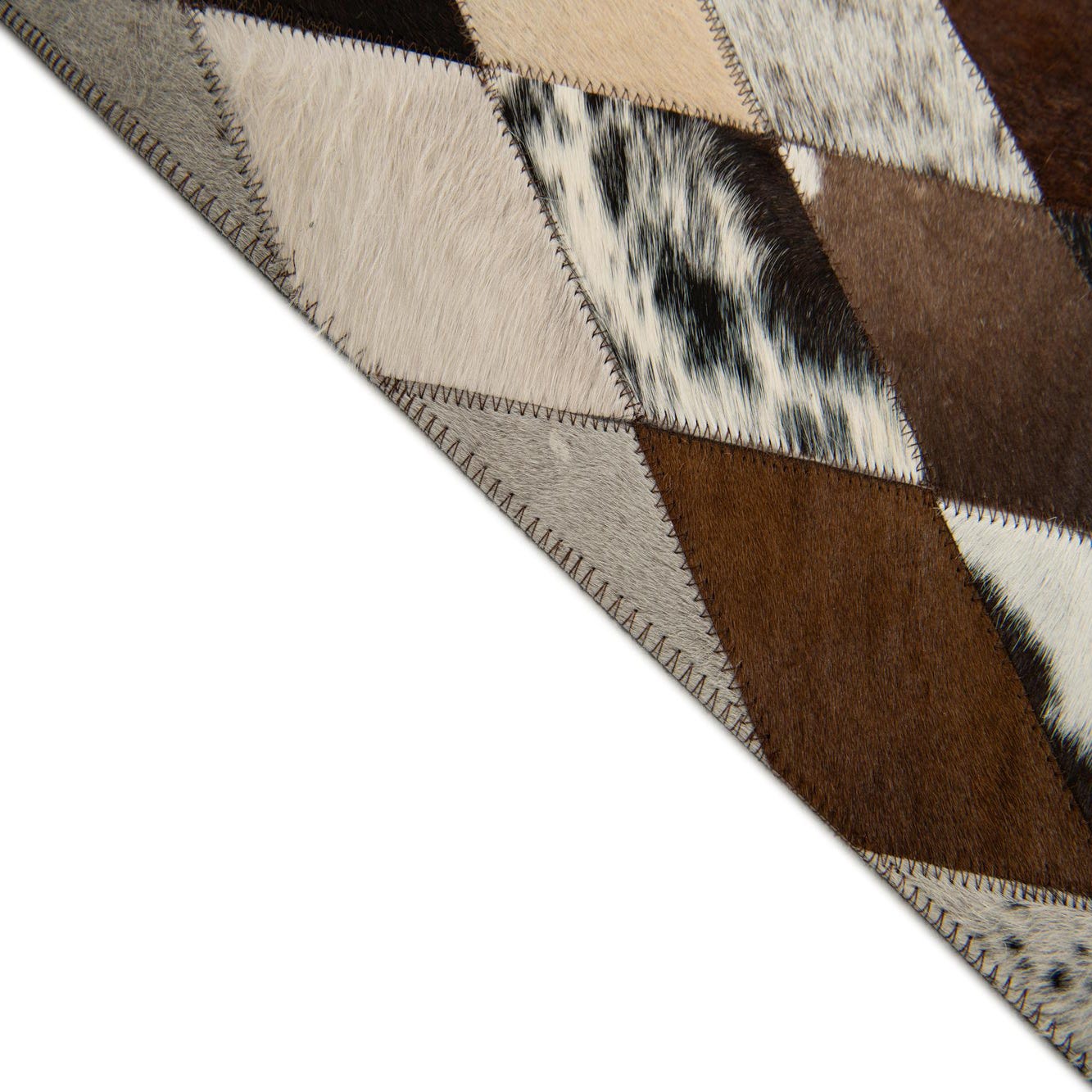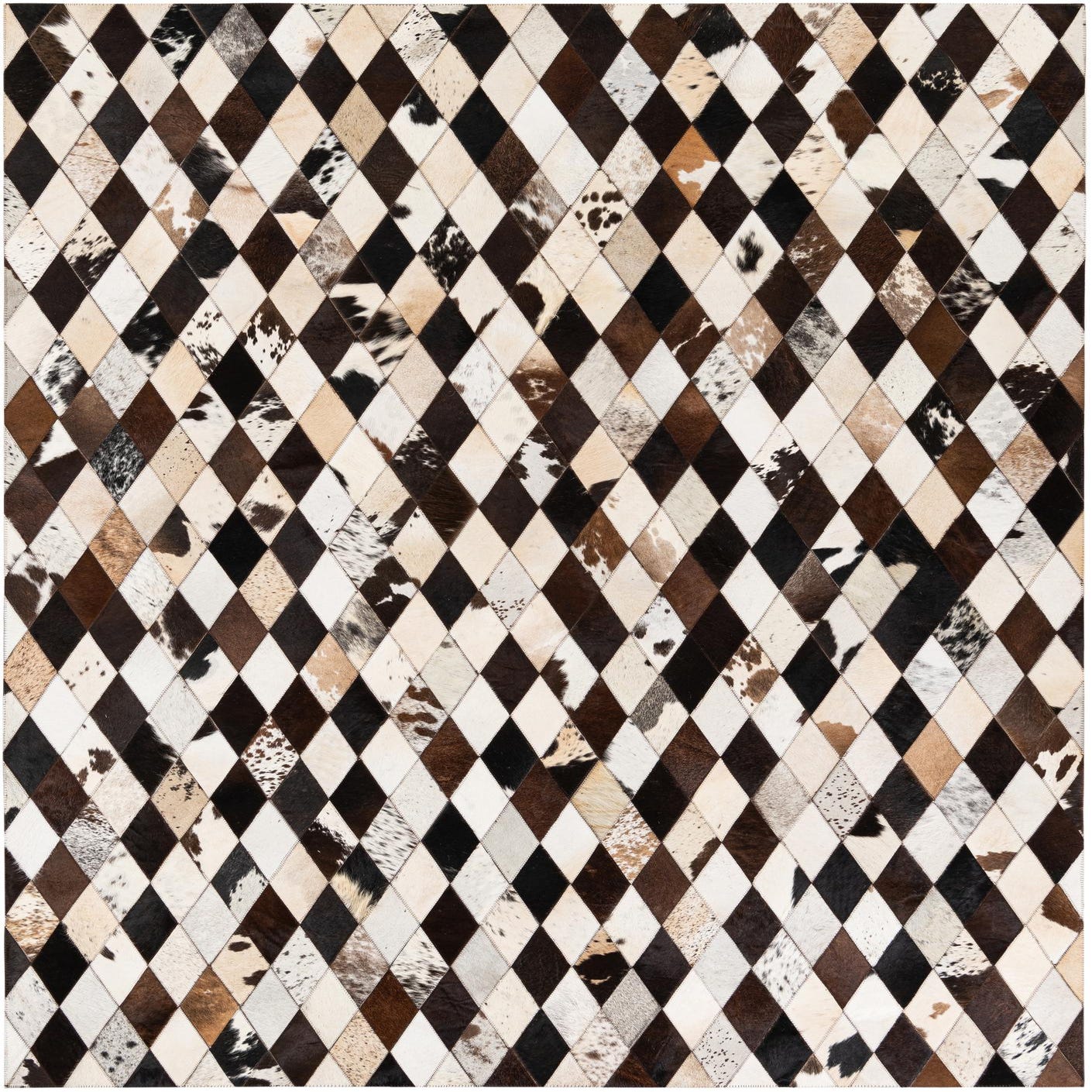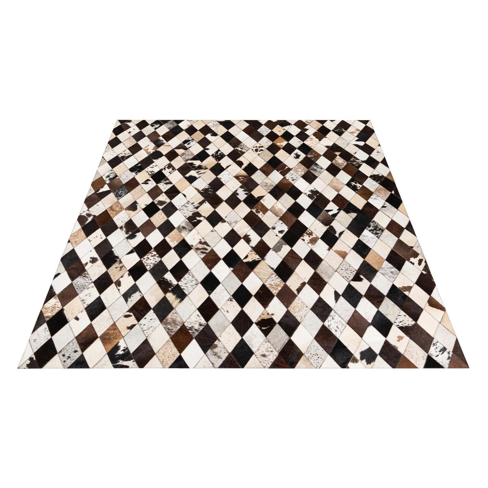 A 5x8 rectangular Cowhide Stocks rug featuring a modern diamond patchwork pattern in multi-colored natural cowhide and leather.