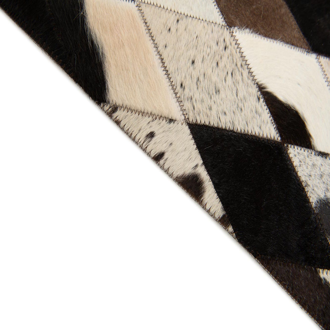 A 5x8 rectangular cowhide rug featuring a modern harlequin diamond pattern in various shades of brown, black, and white.