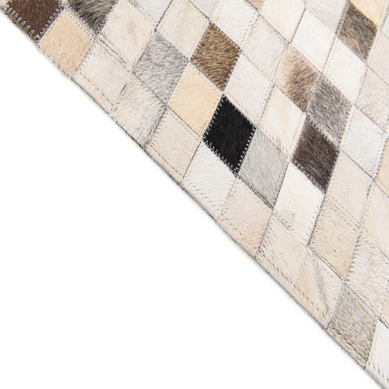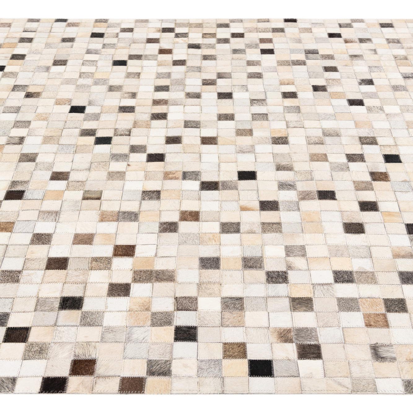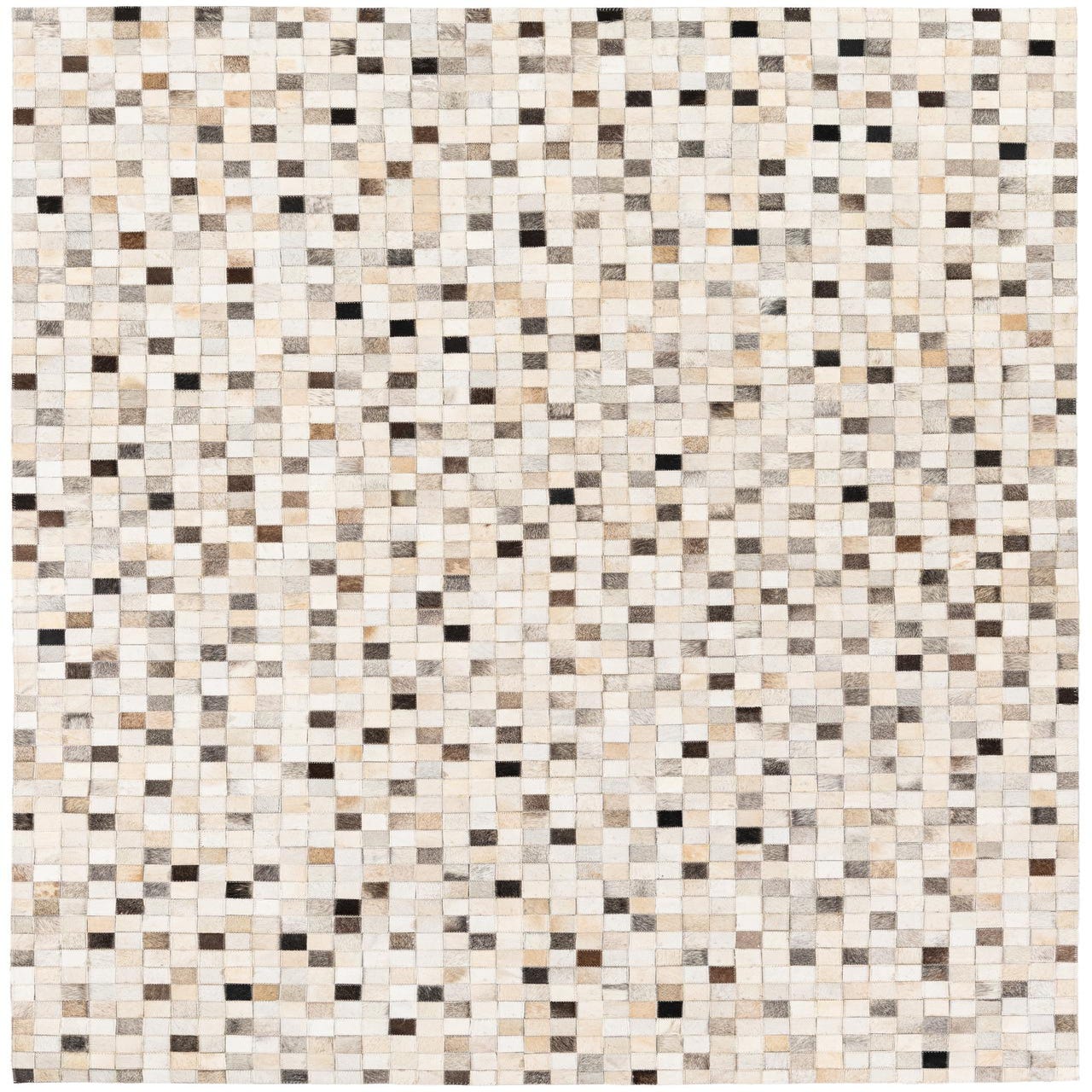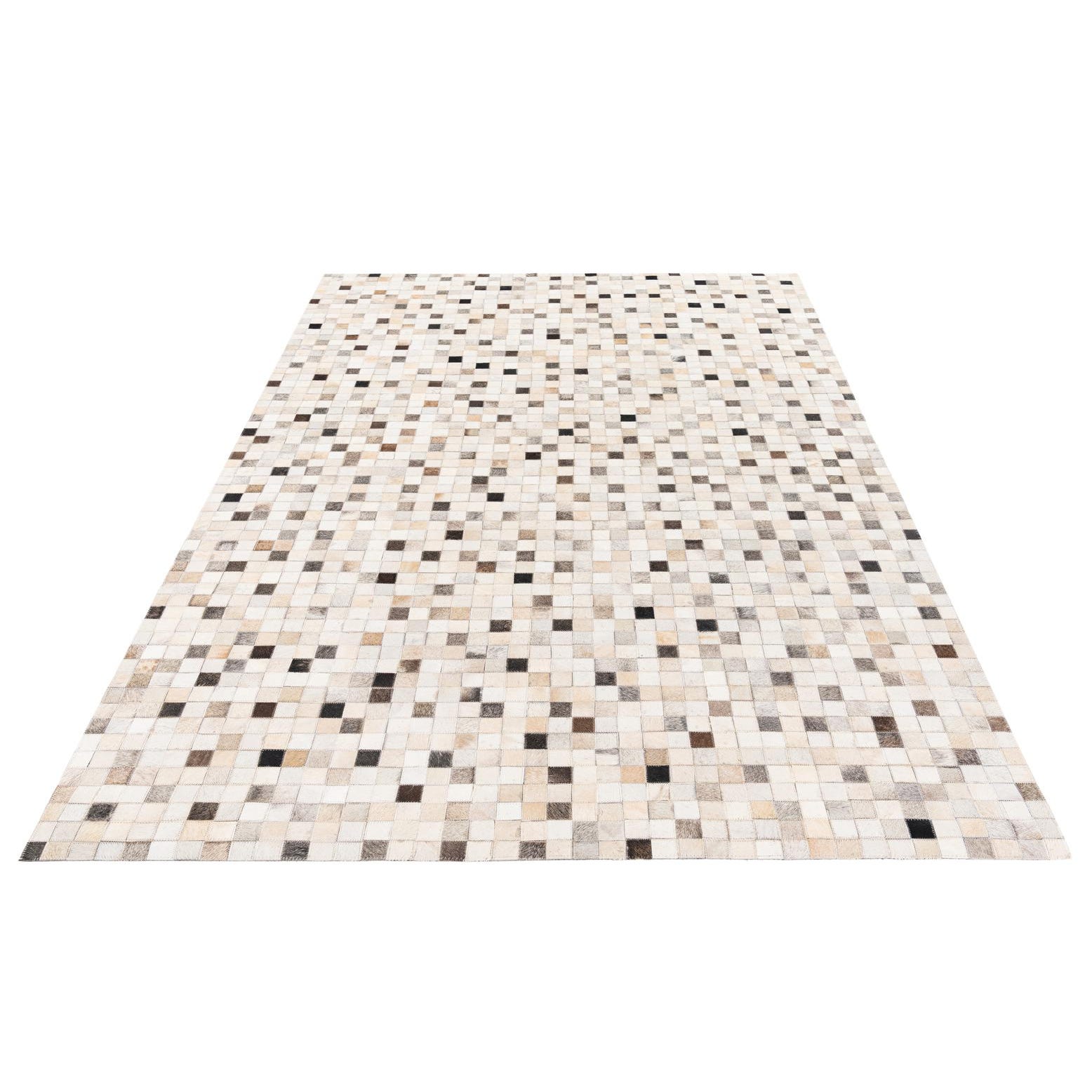 A rectangular 5x8 modern cowhide rug featuring a mosaic pattern of multi-colored squares in shades of white, beige, brown, and black.