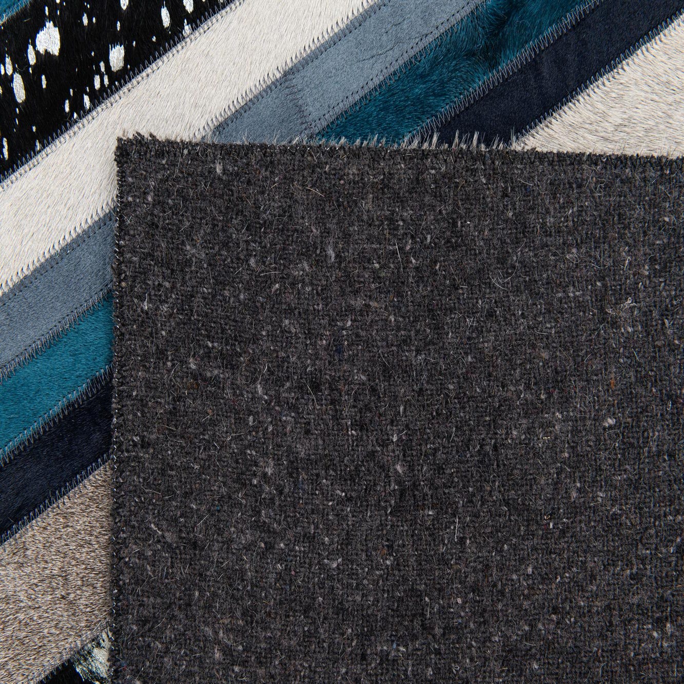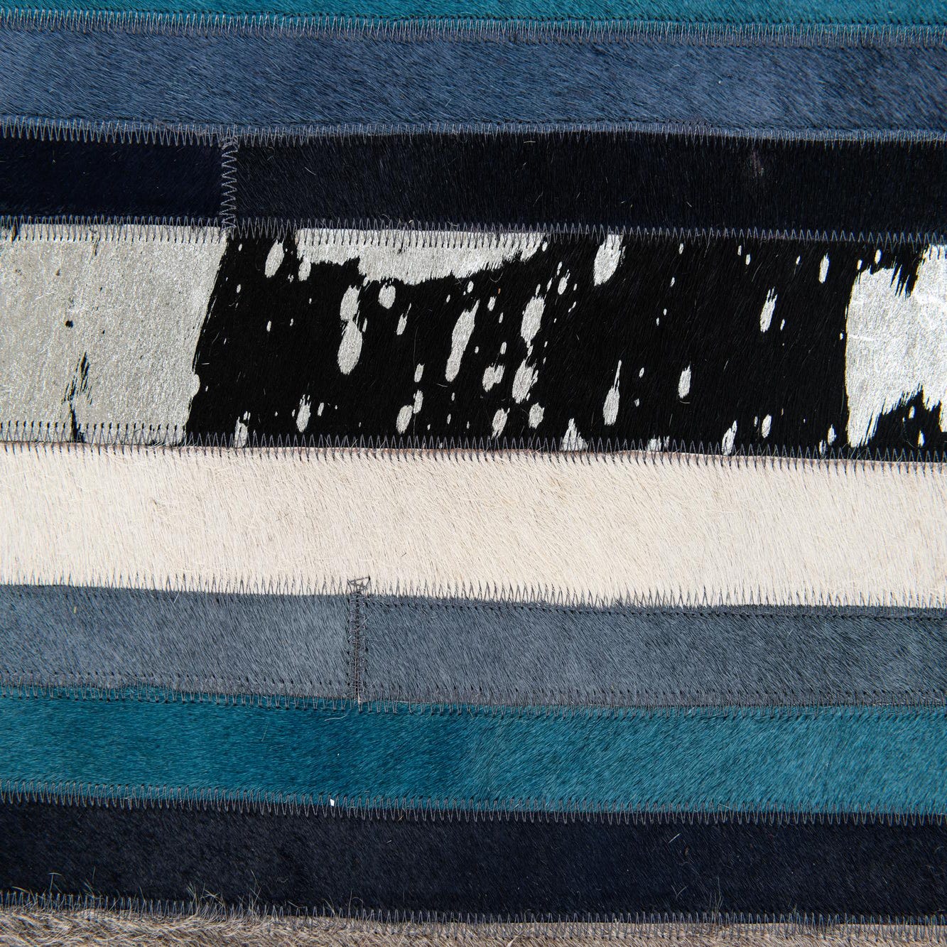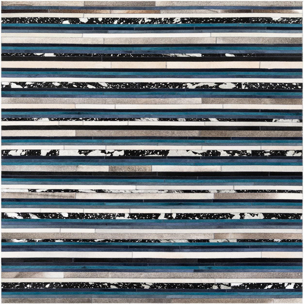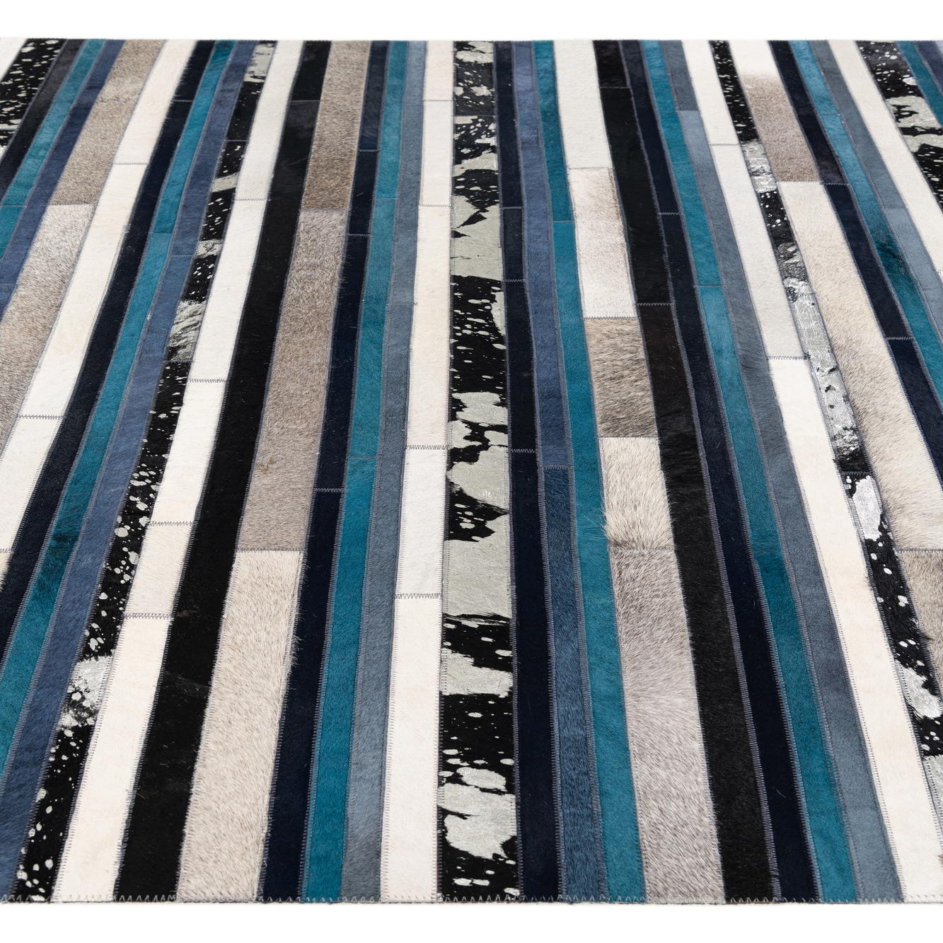 A rectangular 5x8 modern stripe rug made of cowhide and leather, featuring horizontal bands of multi-colored blues, grays, black, and white.