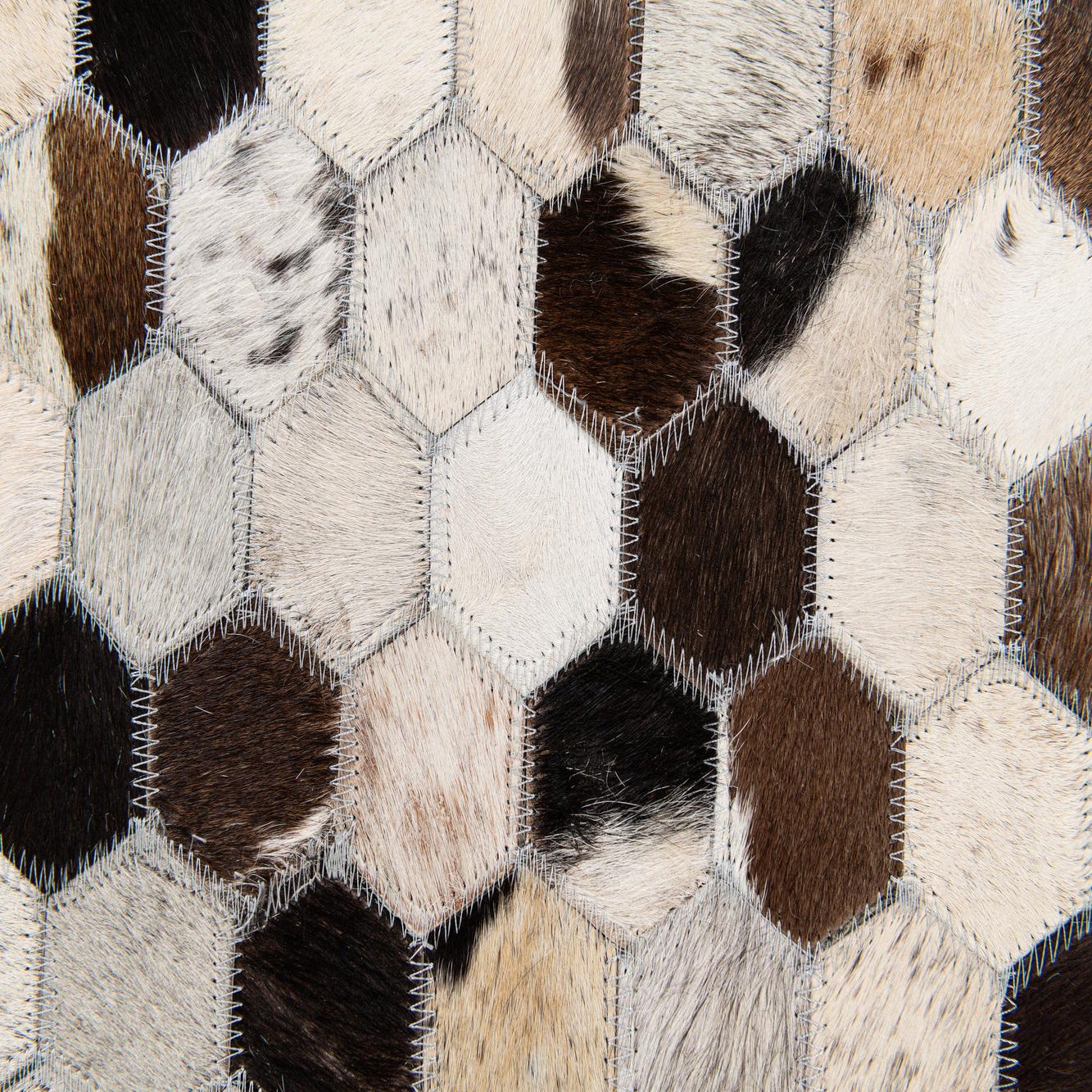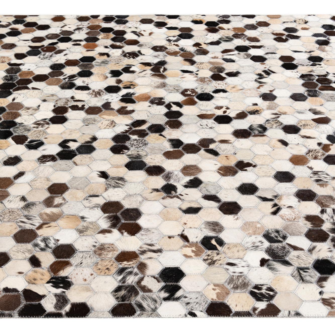 A 5x8 rectangular Cowhide Stocks rug by Rugs.com, featuring a modern multi-colored hexagonal pattern of natural cowhide patches in brown, black, and white tones.