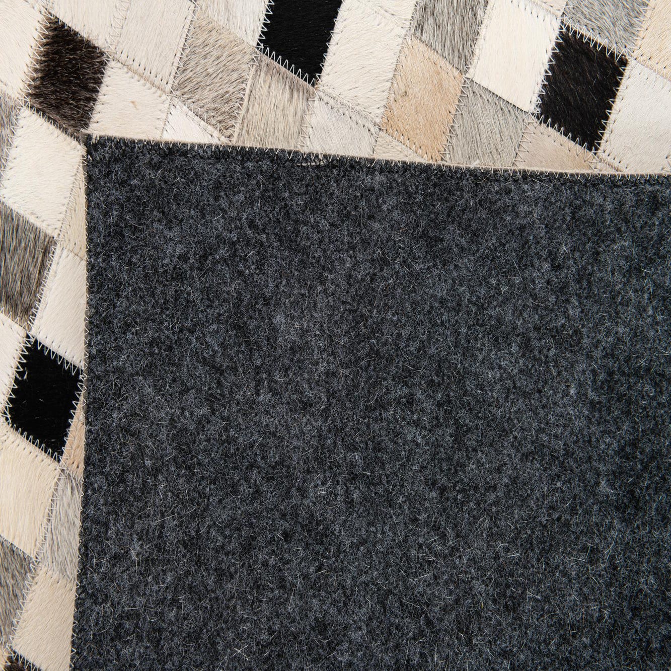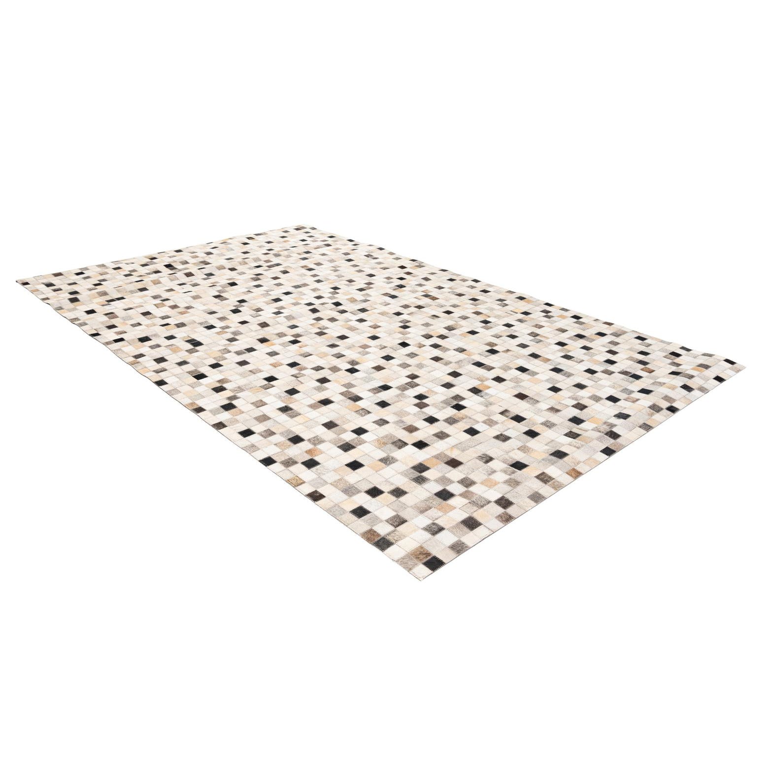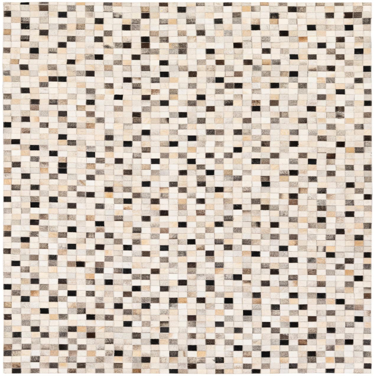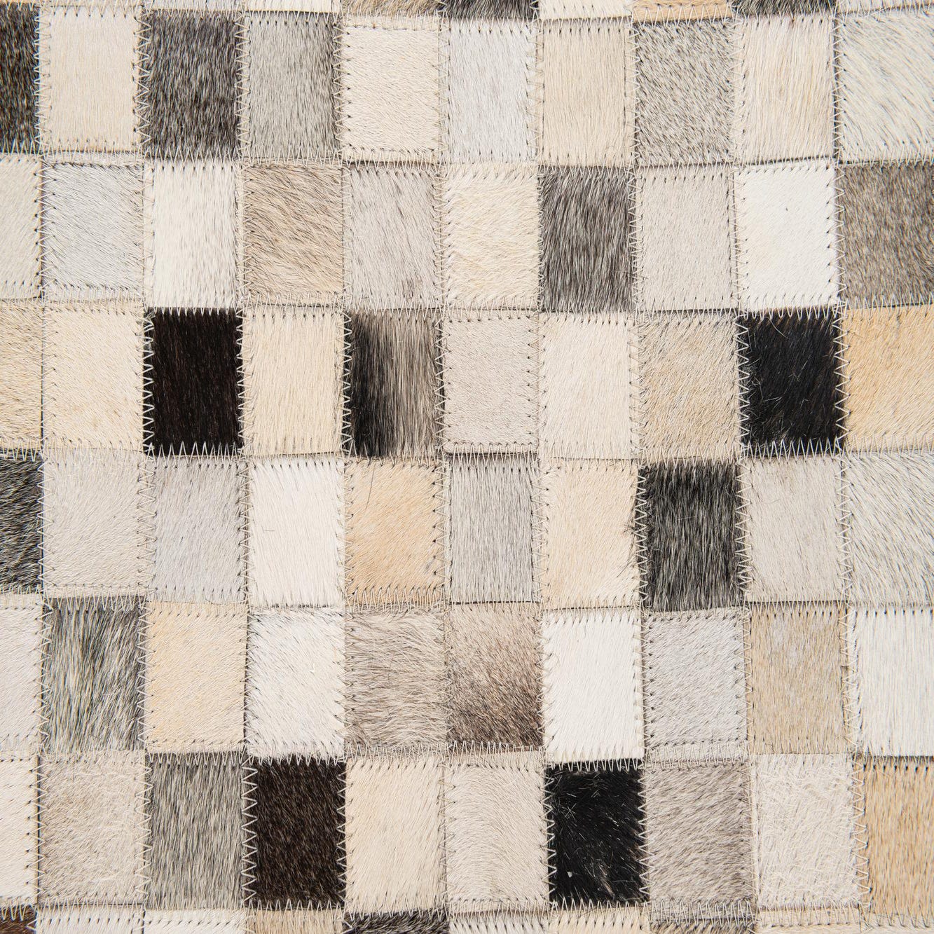 A hand-stitched patchwork of small cowhide squares creates a refined geometric mosaic in neutral tones. The multi background is punctuated by ivory, beige, gray, brown and black tiles that form an allover, pixel-like pattern with natural variation in each hide. Handmade of cowhide and leather, the rug’s hair-on-hide surface has a low, tactile nap and a subtle sheen that catches light differently across the tiles, while the visible seams between patches add a gentle, structured texture underfoot.