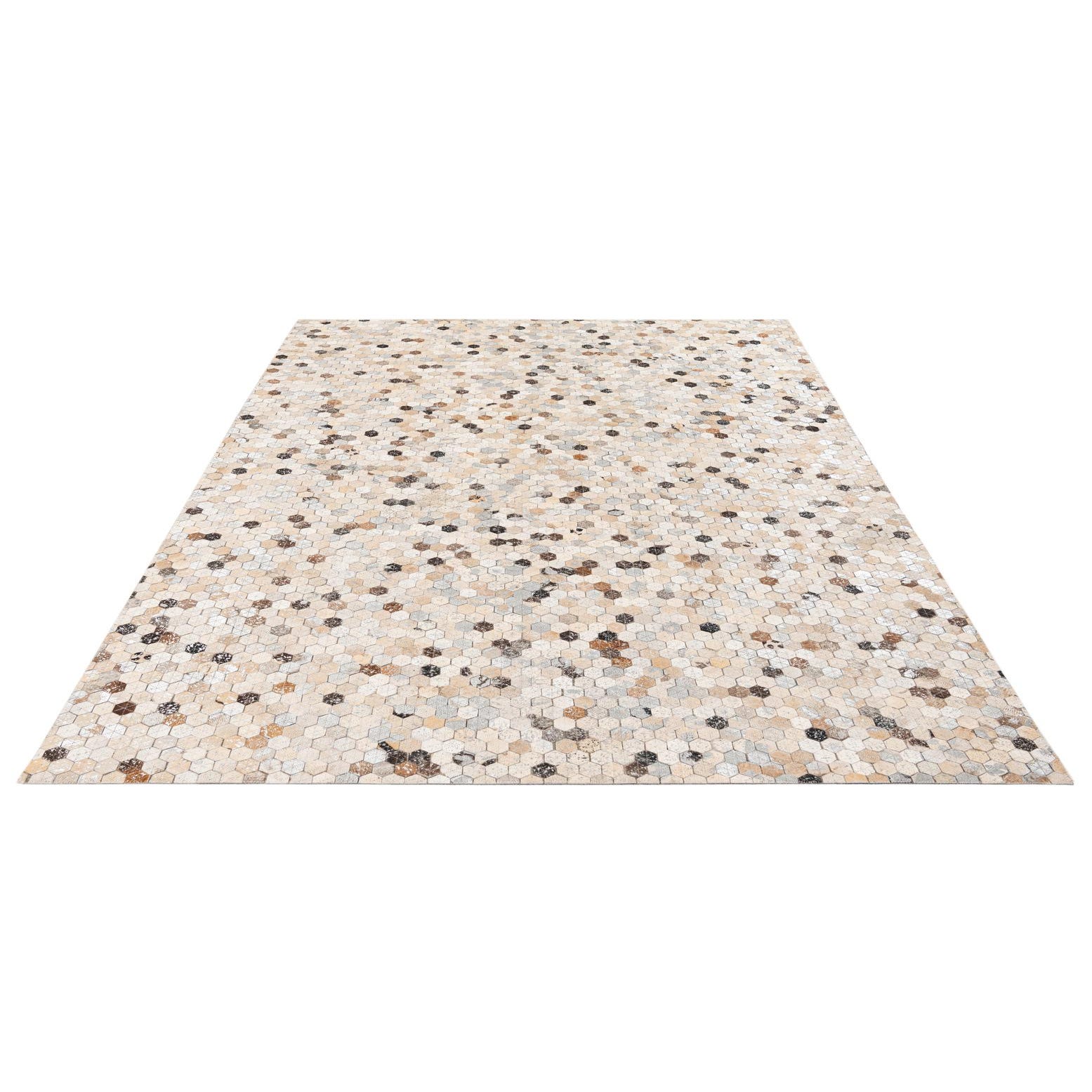 A 5x8 rectangular Cowhide Stocks rug featuring a modern multi-colored hexagonal pattern in natural shades of beige, brown, and gray.