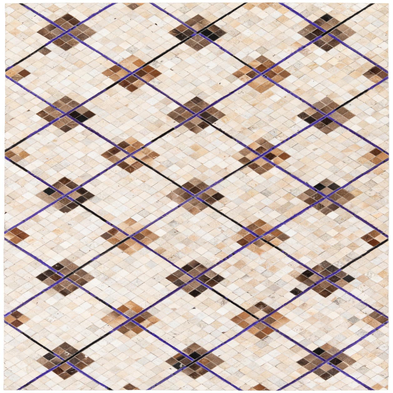 A 5x8 rectangular Cowhide Stocks rug featuring a modern argyle pattern in multi-colored cowhide and leather.