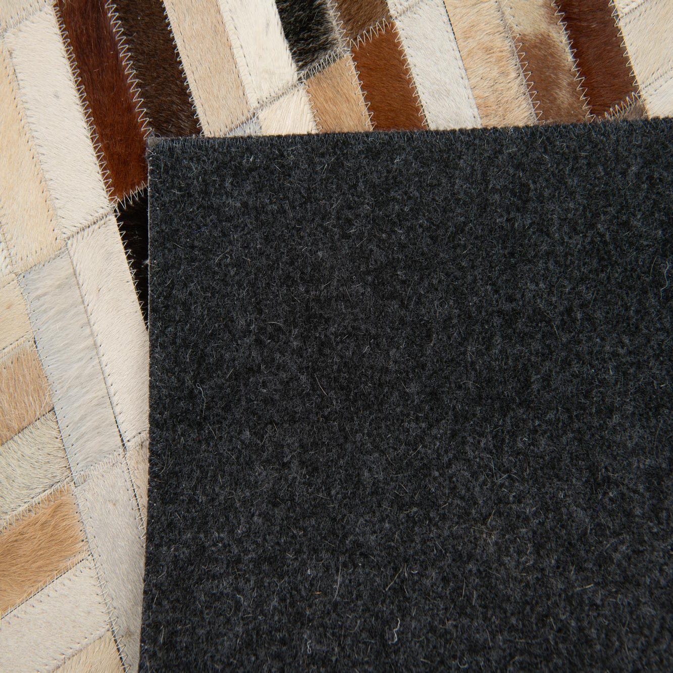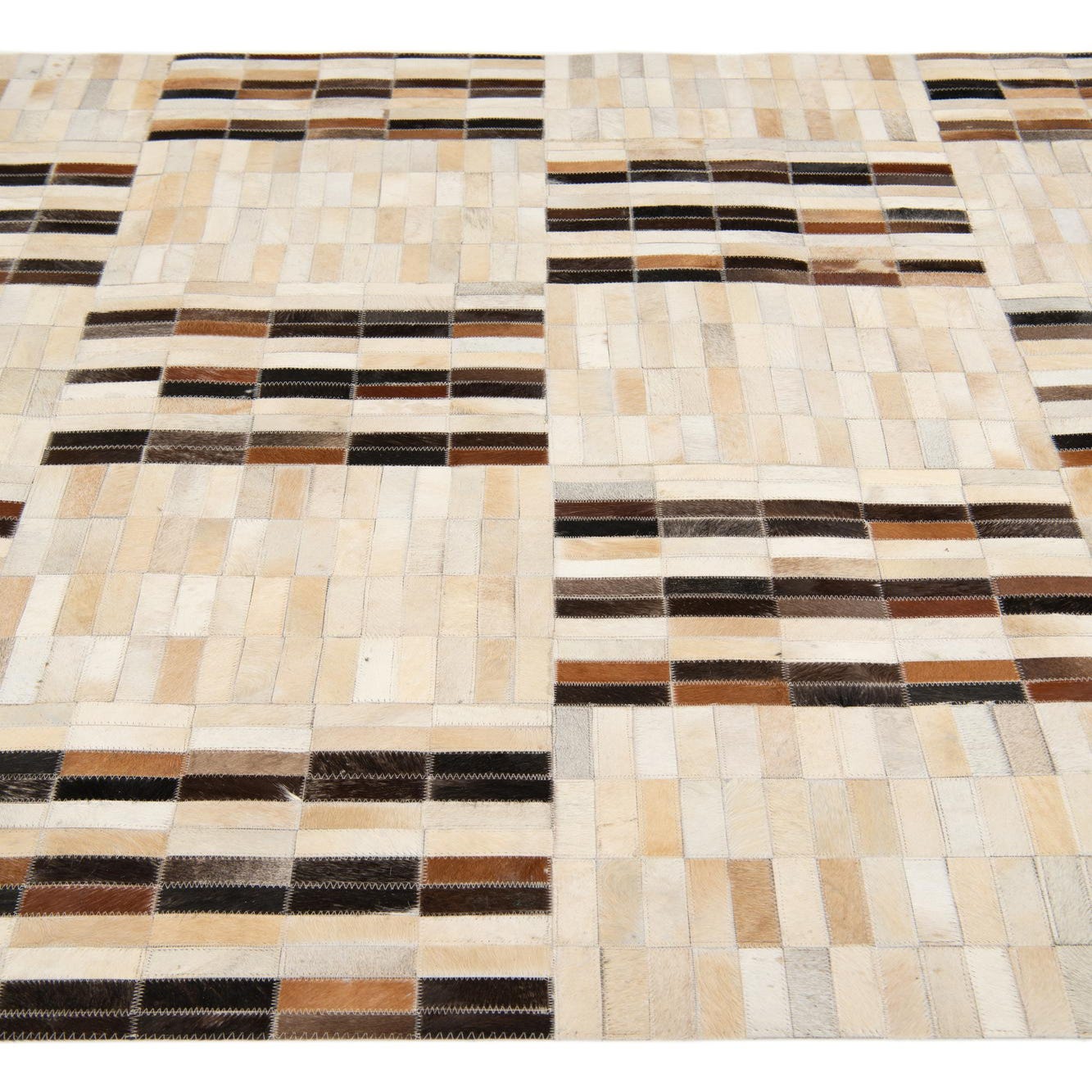 Hand made of cowhide and leather, this rug presents a refined patchwork layout of rectangular tiles arranged in a subtle checkerboard. Blocks of narrow vertical strips in black, brown and light brown alternate with softer fields in ivory and beige, creating a balanced contrast between bold accents and warm neutrals. The multi-hued background ties the composition together, while the hair-on-hide surface offers a low, tactile nap with a gentle, natural sheen where each hide meets the next.