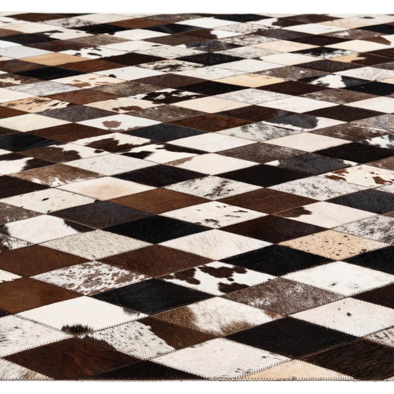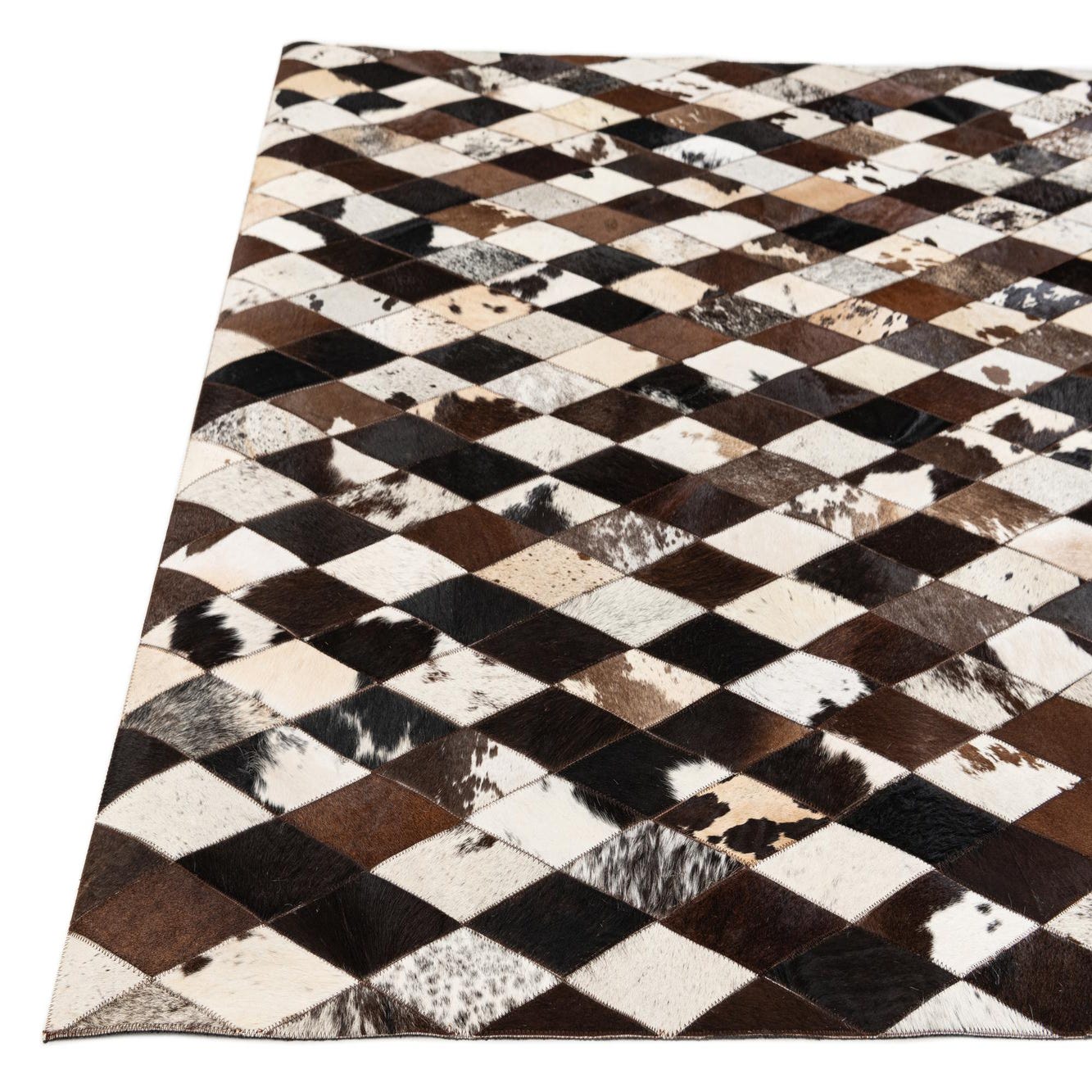 A 5x8 rectangular Cowhide Stocks rug featuring a modern diamond pattern in multi-colored natural cowhide patches.