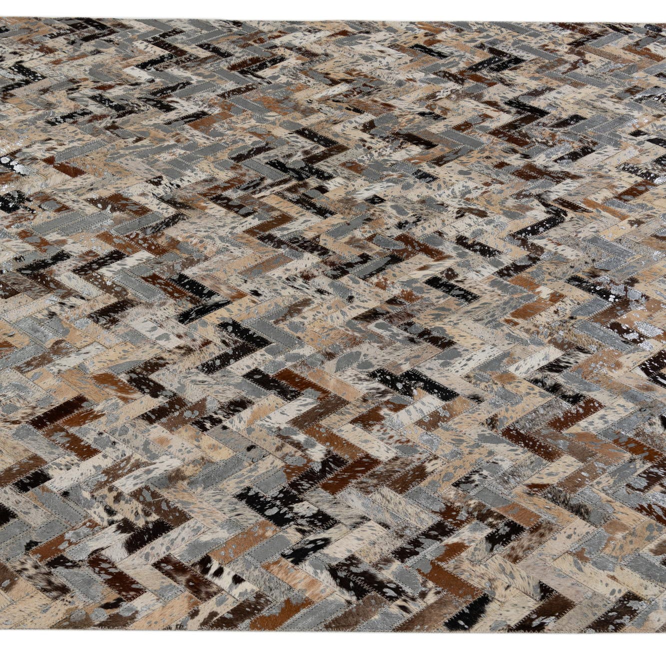 A rectangular 5x8 multi-colored patchwork cowhide rug with a geometric chevron pattern, ideal for a living room.
