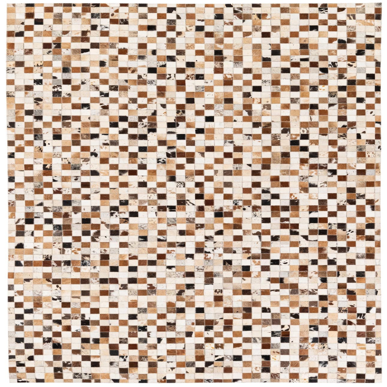 A rectangular 5x8 modern rug made from multi-colored cowhide and leather patches in a checkerboard pattern.