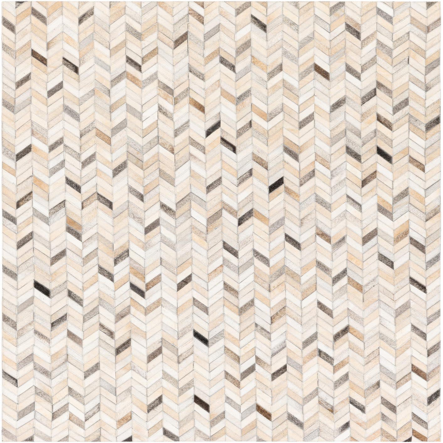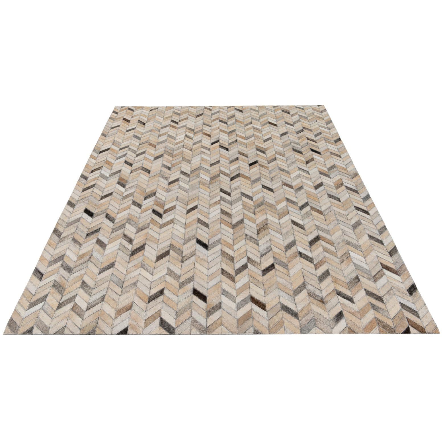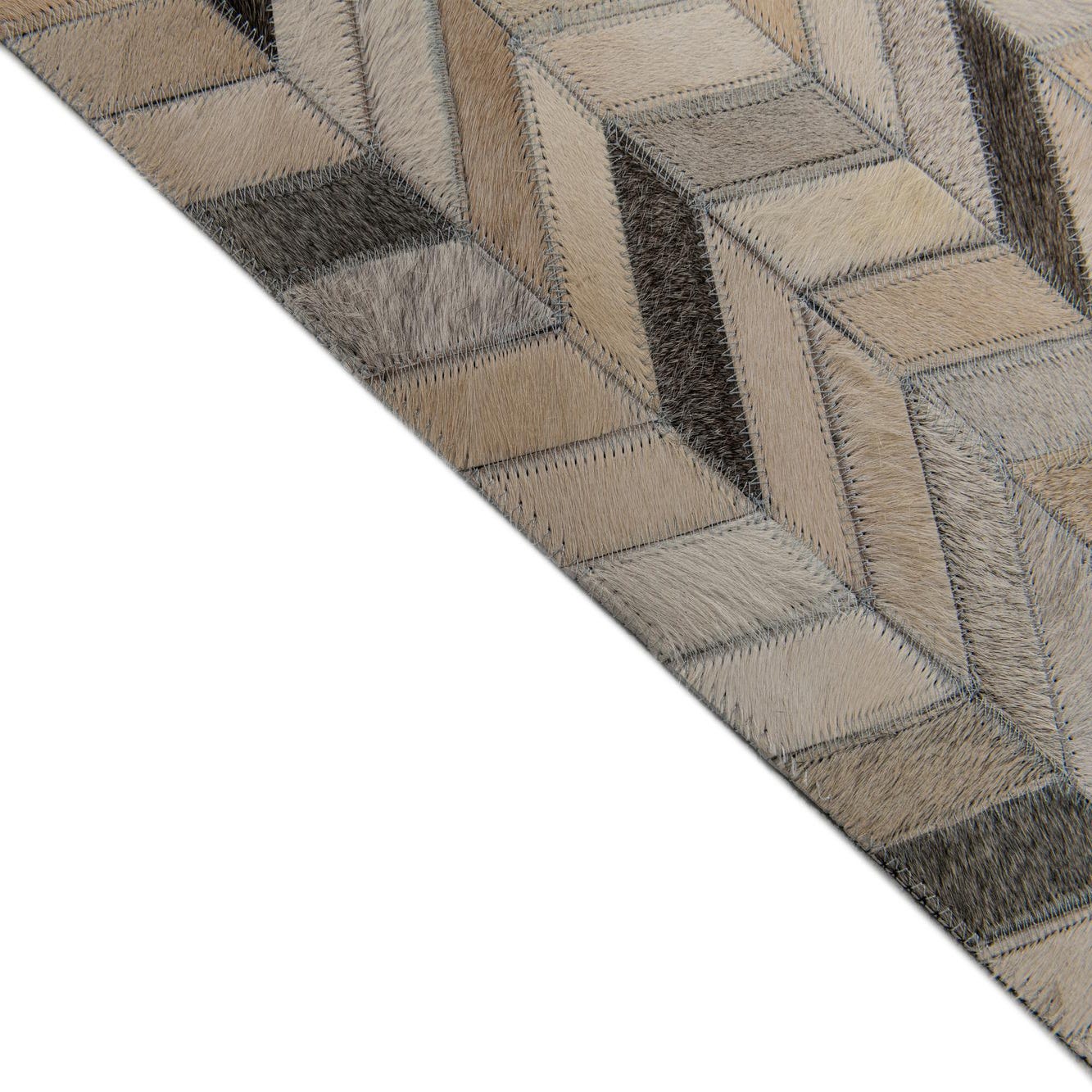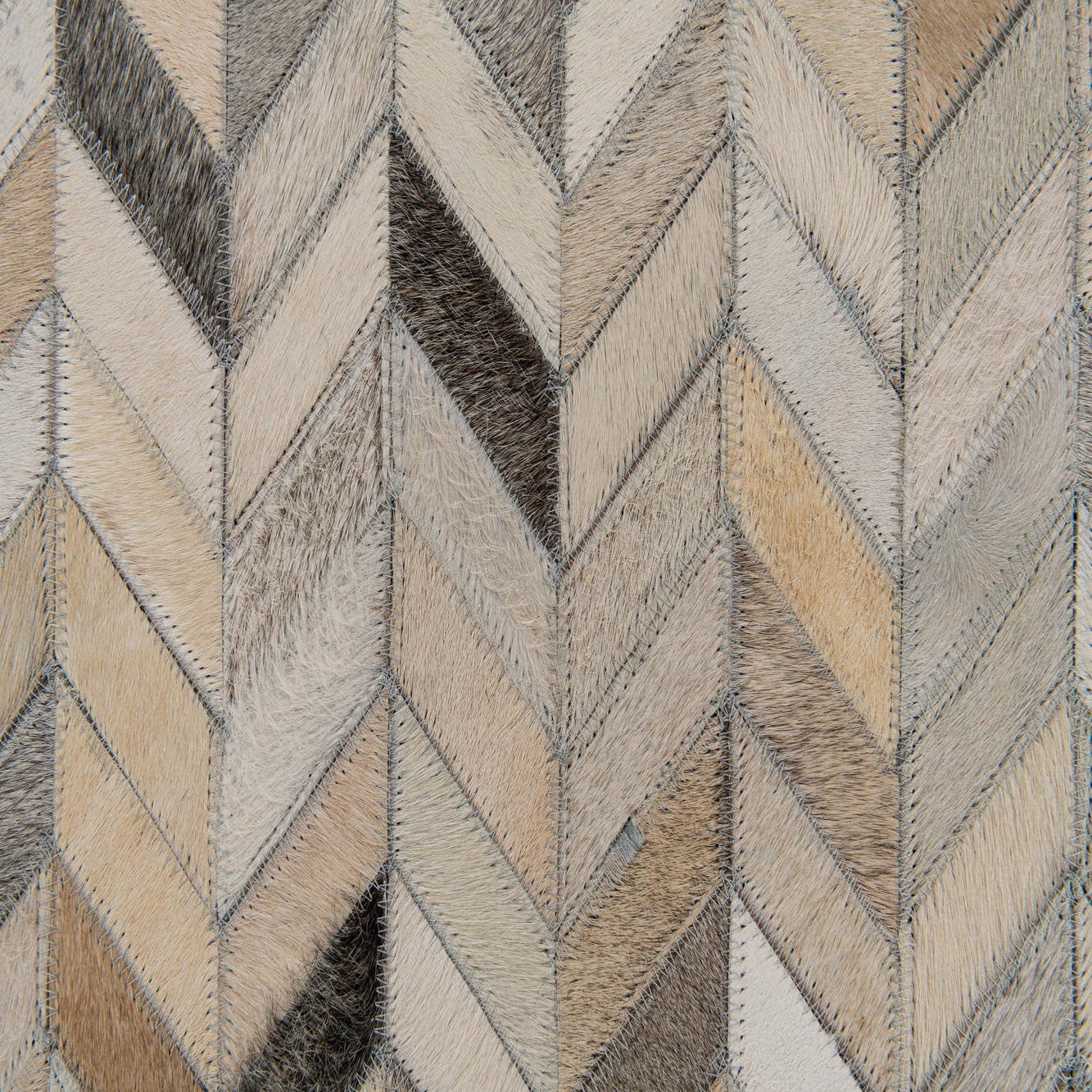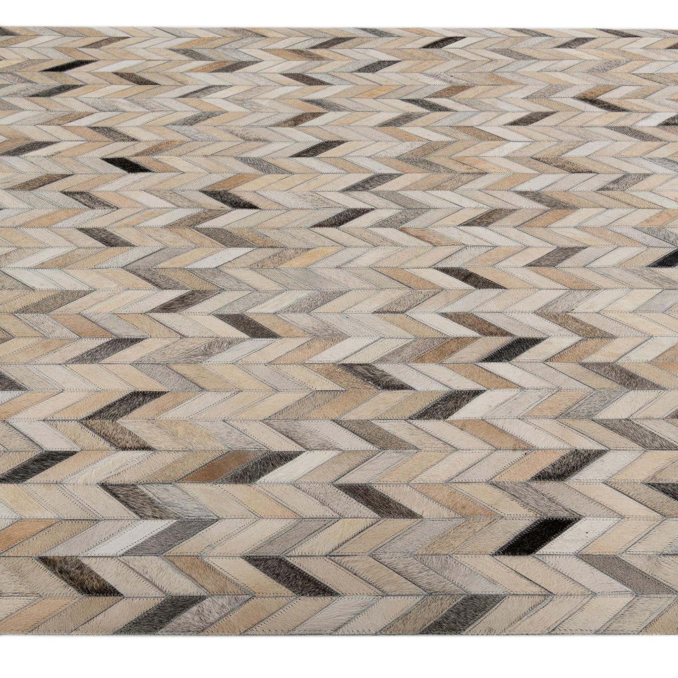 A 5x8 rectangular Cowhide Stocks rug by Rugs.com, featuring a modern chevron pattern in multi-colored natural cowhide and leather.