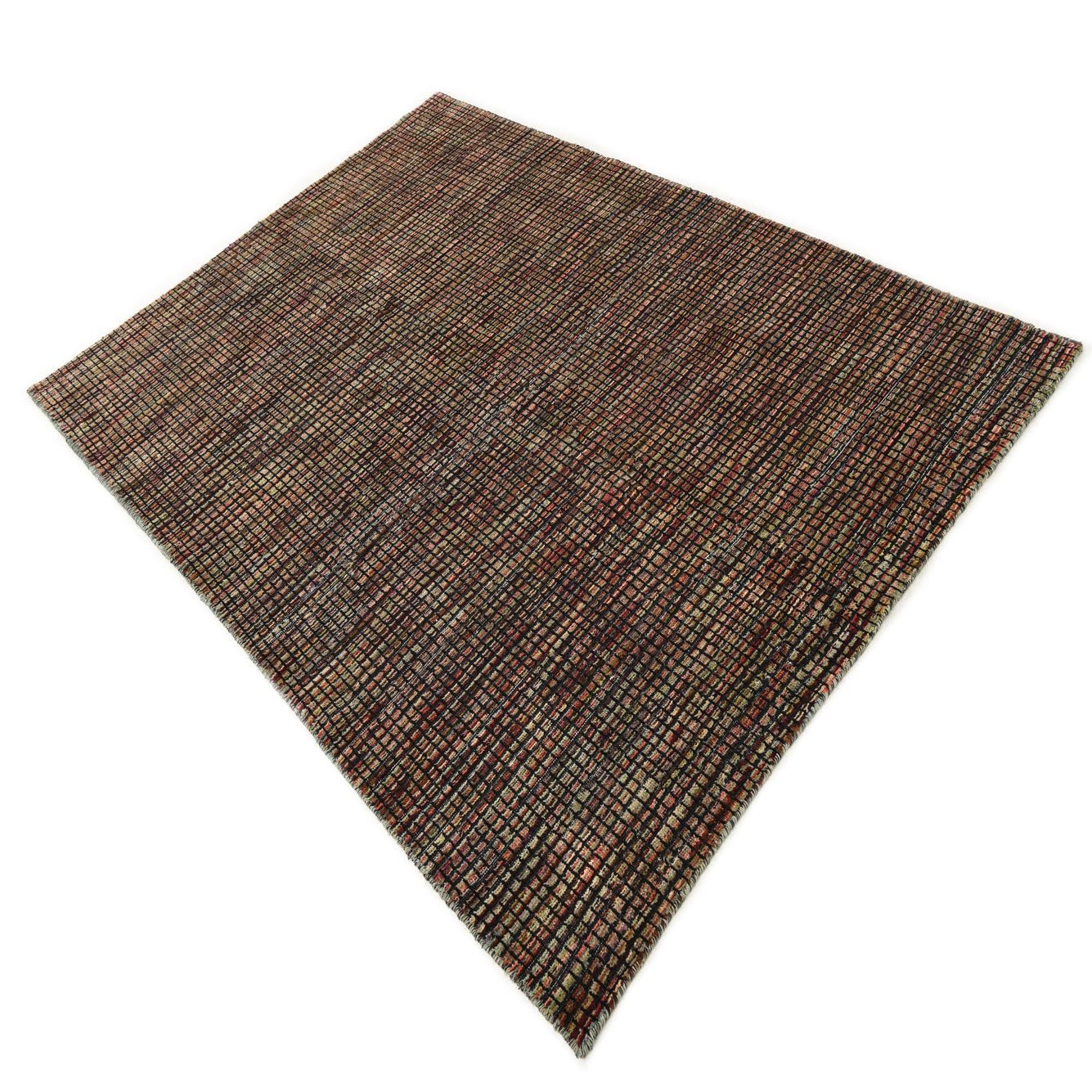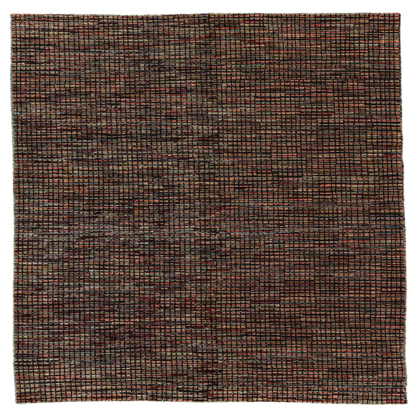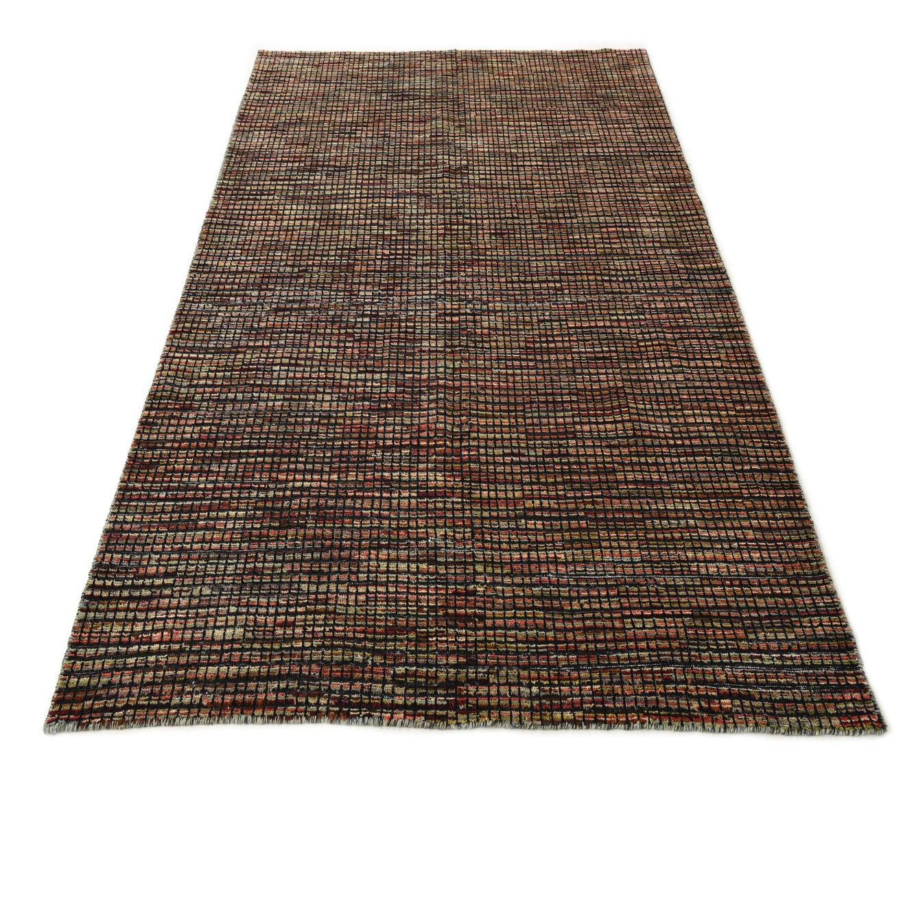 A 5x8 rectangular Darya rug with a multi-colored modern abstract pattern, featuring shades of brown, red, green, and black in a textured, high-pile wool weave.