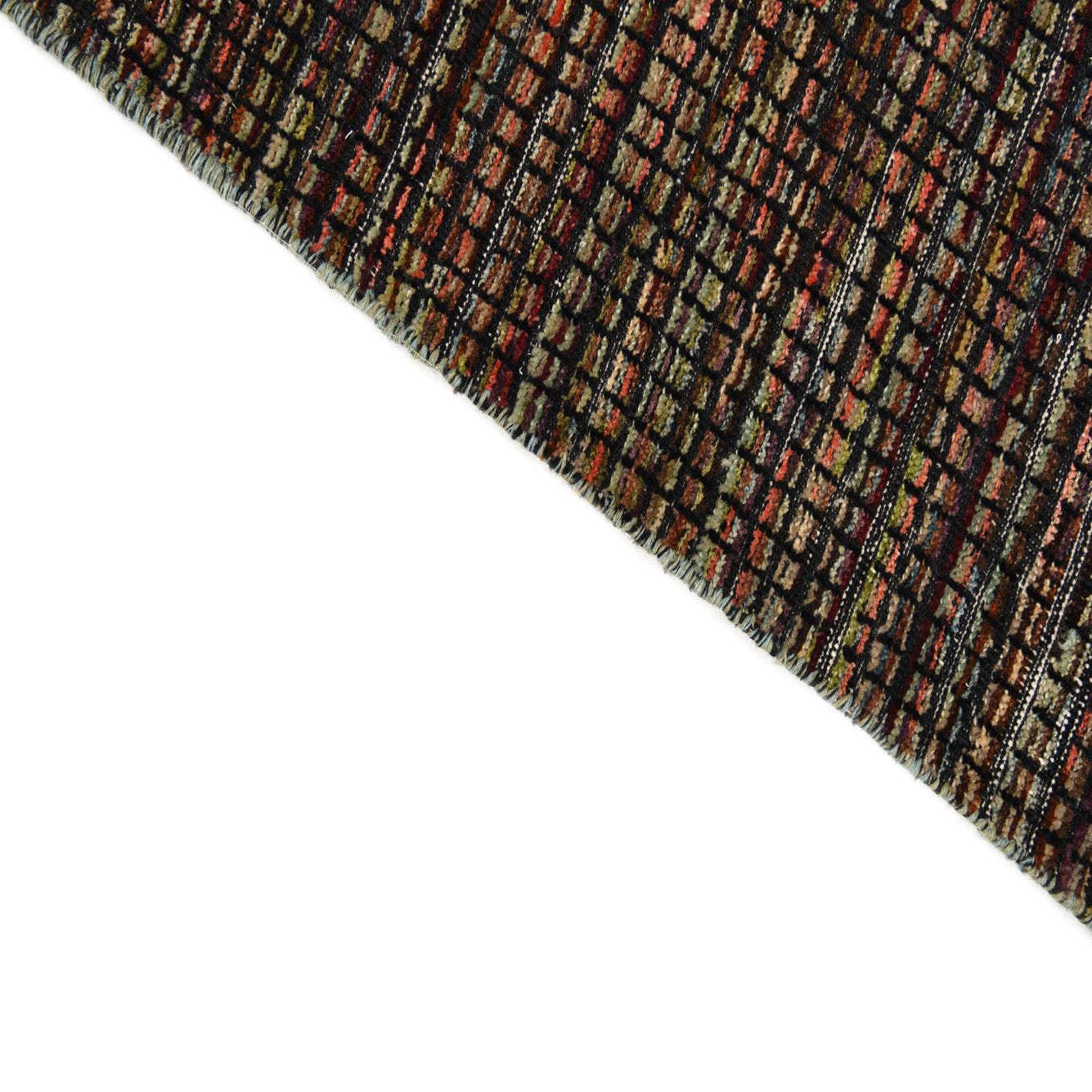 The rug's texture is indicative of its hand-knotted construction, showcasing the meticulous craftsmanship and providing a tactile dimension to its aesthetic. The intricate interplay of colors gives the piece a dynamic presence that can complement various decor styles, from eclectic and bohemian spaces to more traditional settings.