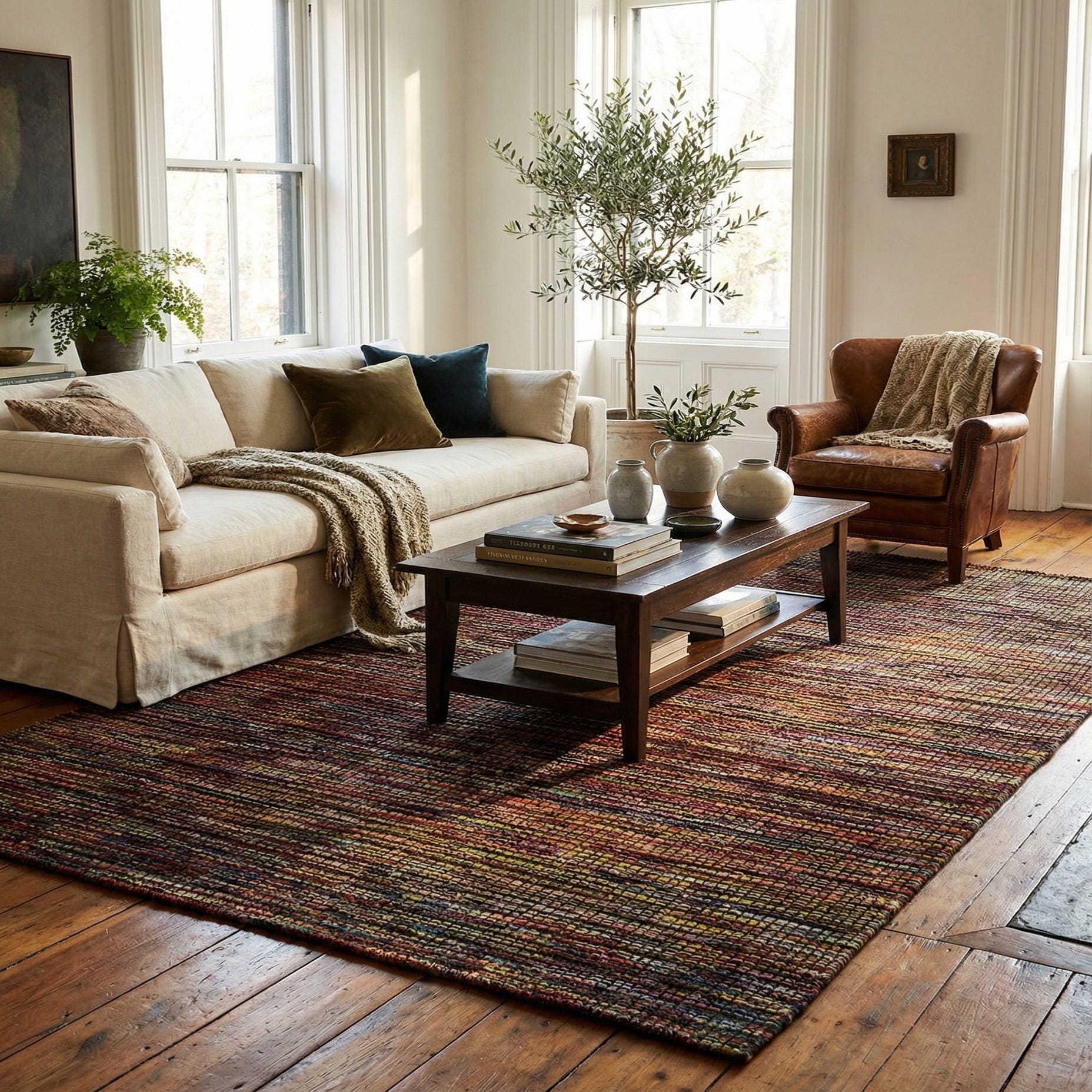 The pattern bridges contemporary geometry and artisanal texture, making it a versatile choice for a variety of interiors. Pair it with warm wood furniture and neutral upholstery to let the burgundy and blue accents add color, or layer it with patterned pillows and mixed metals for a more eclectic, collected look. It’s well suited to anchor a living room seating area, define a compact dining nook, or add visual interest at the foot of a bed.