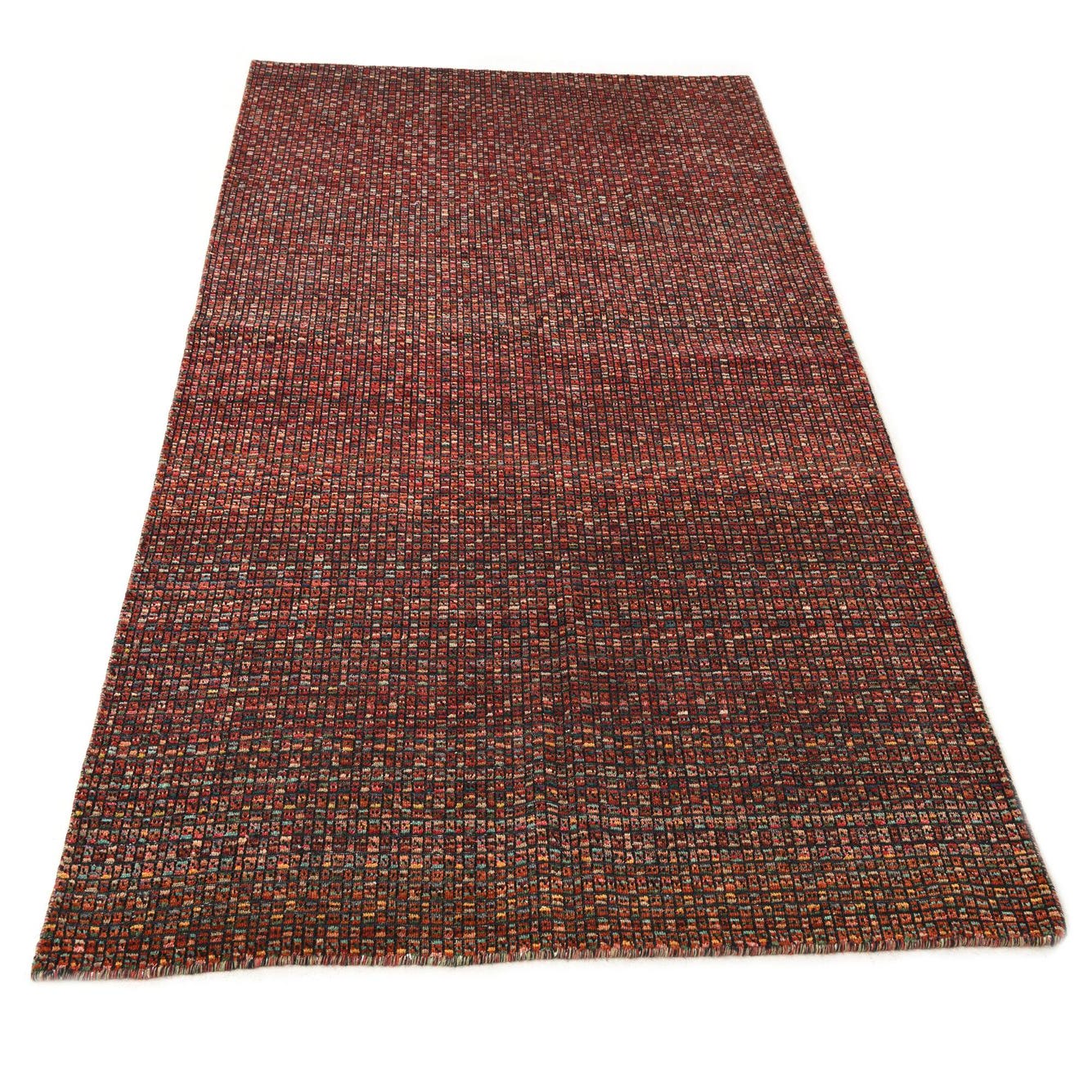 A rectangular 5x8 Darya rug in multi-colored wool, featuring a textured modern abstract pattern with rich reds, blues, and yellows.