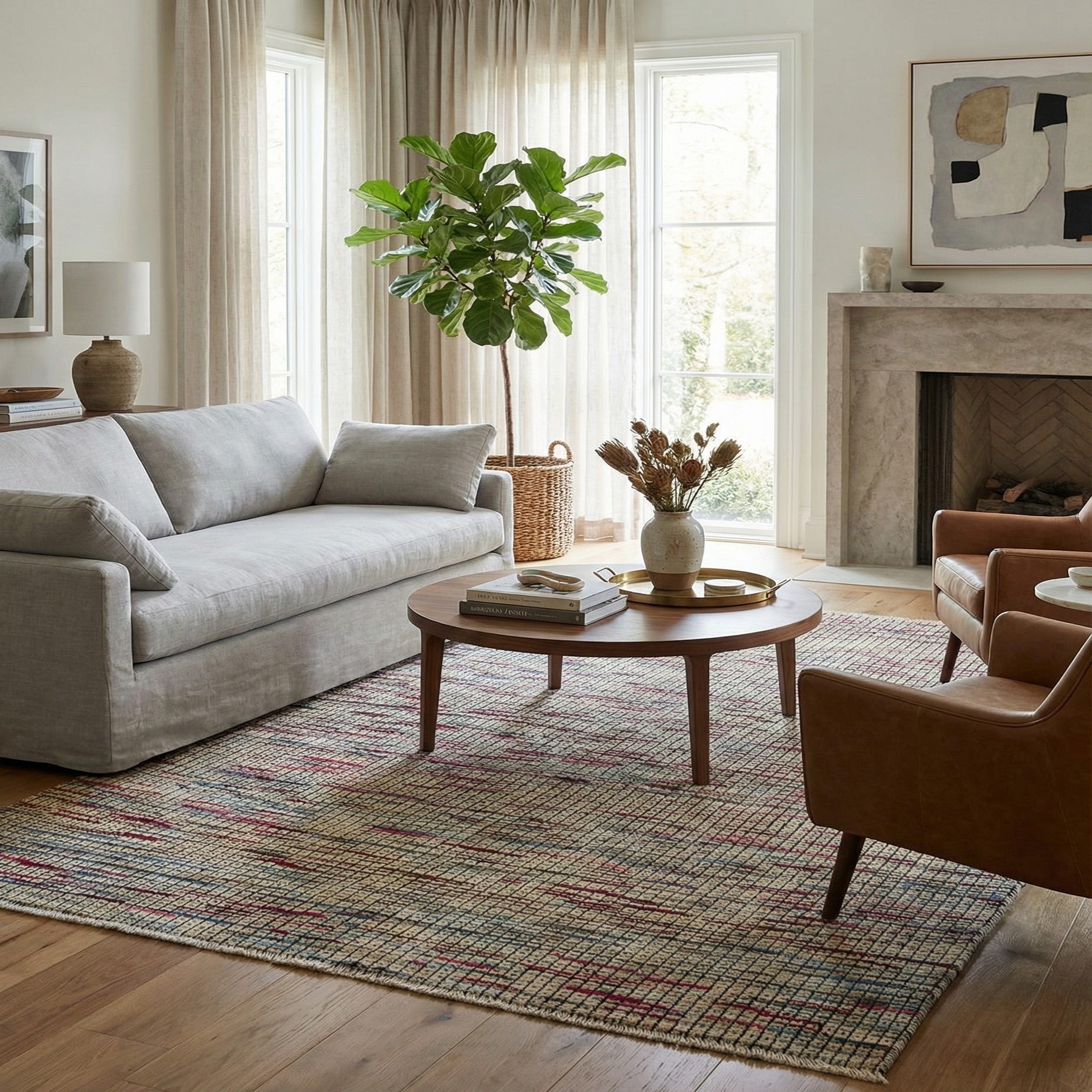 The combination of colors ensures versatility in interior design, allowing this piece to complement rooms with both neutral and bold color schemes. The textural quality of the wool lends a tactile dimension to the rug, emphasizing comfort and warmth underfoot.
