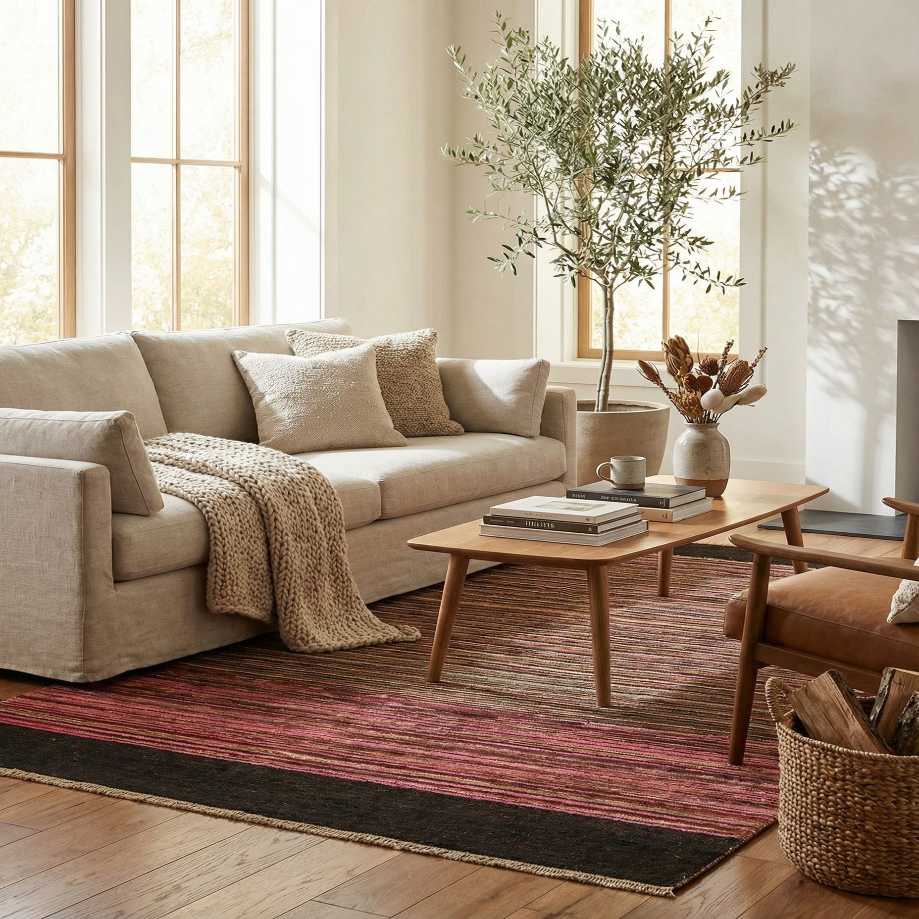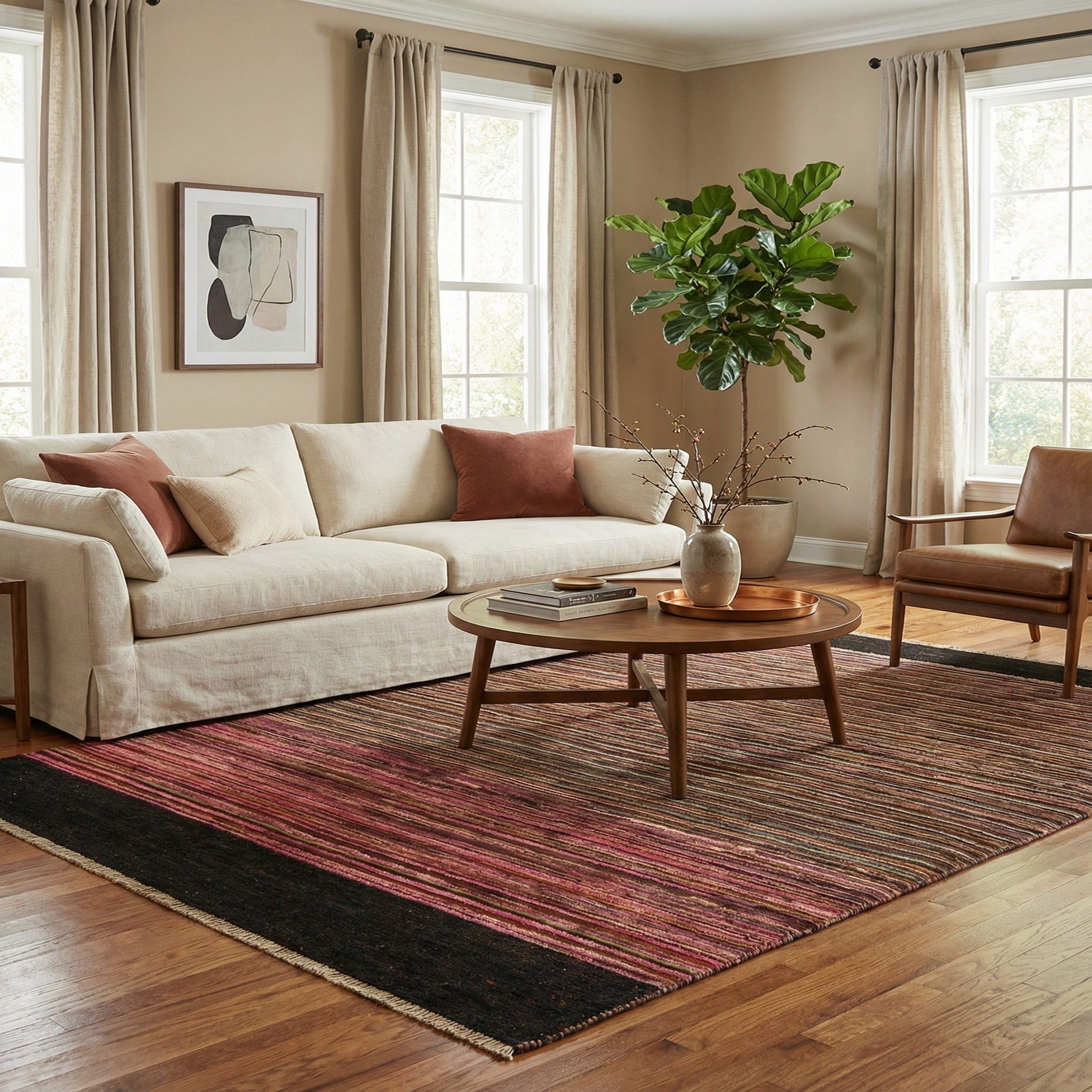 A 5x8 rectangular Darya rug featuring a bold black top border and vibrant multi-colored horizontal stripes in pinks, browns, and blues.