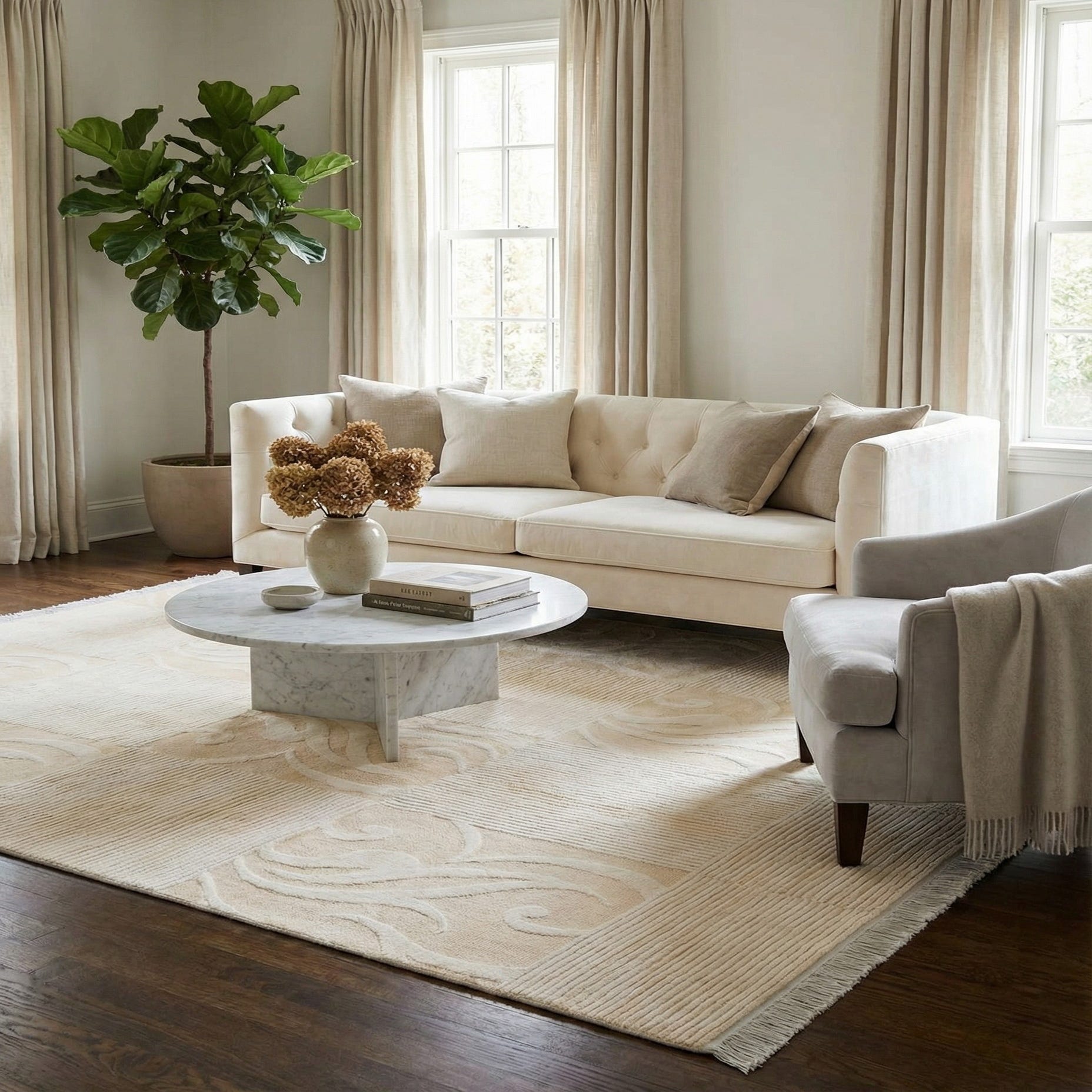 This rug suits a range of interiors that favor calm, neutral palettes. Use it to anchor a living room seating area over warm wood floors for a layered, inviting feel; place it under a bed to add a soft landing to a serene bedroom; or set it in an entry or study to introduce subtle pattern without overwhelming the space. Its neutral tones and mixed textures pair well with modern Scandinavian, transitional, coastal, or contemporary farmhouse décors.