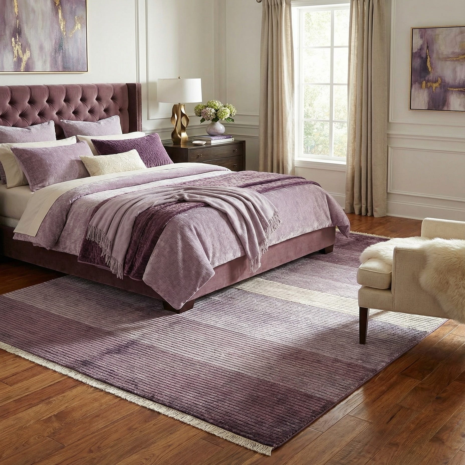 A 5x8 rectangular Darya Collection wool rug featuring horizontal stripes in varying shades of purple and a cream stripe.
