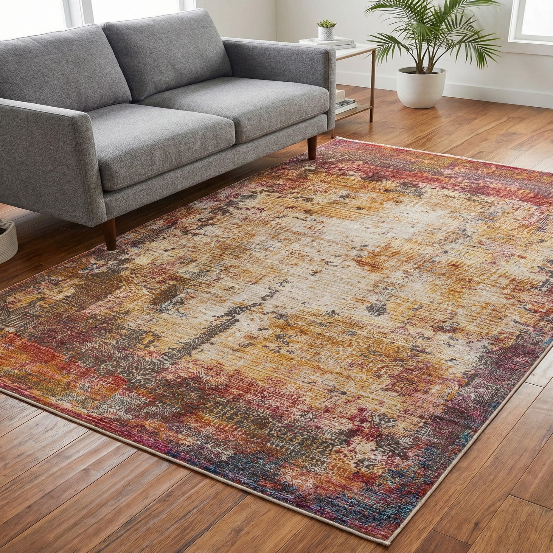 A distressed, vintage-inspired pattern gives this machine-made, 100% polyester rug a lived-in, layered look. Faded border motifs and scattered medallion fragments sit atop a multi-hued background, where ivory and gray mingle with warm gold and rust tones. Accents of blue and navy blue anchor the composition, while touches of red, yellow and pink add lively contrast. The low, dense polyester pile has a soft hand with a subtle sheen, delivering visible textural variation across the surface and a smooth, even feel underfoot.