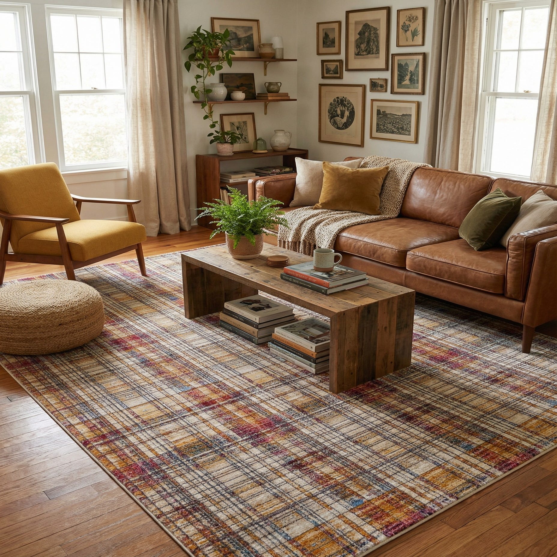 This piece works equally well in modern and transitional interiors — anchor a living area or home office with a neutral sofa and warm wood tones to let the rug’s colors glow, or use it to add energy to a minimalist space with black metal accents and crisp white walls. It also complements eclectic or mid-century schemes when paired with leather seating, brass hardware, and jewel-toned pillows, and can tie together a layered, bohemian vignette with woven baskets and natural textures.