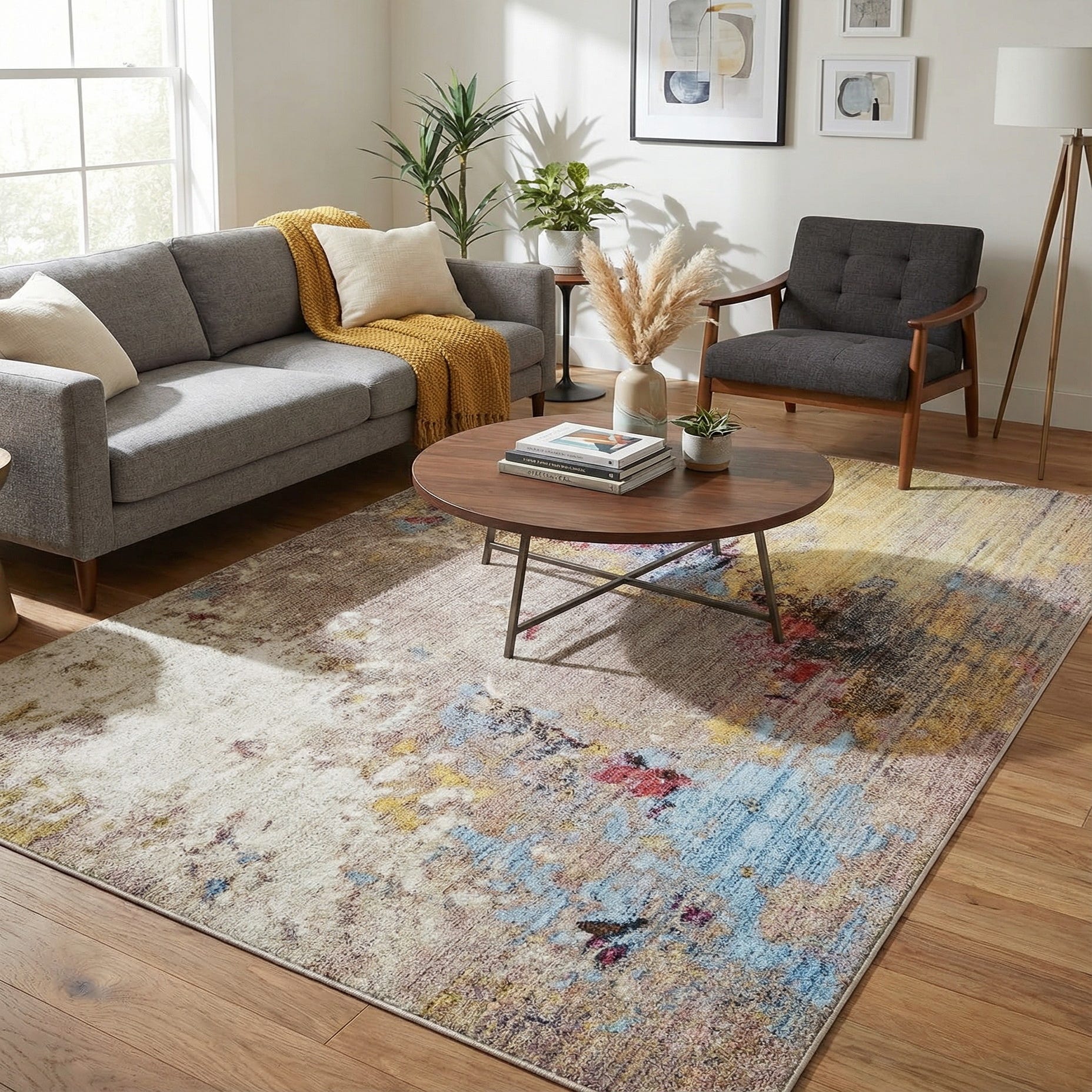A painterly, abstract pattern brings layered washes, soft blurs and vertical drips across a Multi background. Warm beige and cream fields provide a neutral base while pops of blue, olive, rust red, yellow, pink and gray mingle with deeper brown accents for a lived-in, artistic look. The overall style blends contemporary artful distressing with subtle color variation, creating visual interest without a defined repeat.