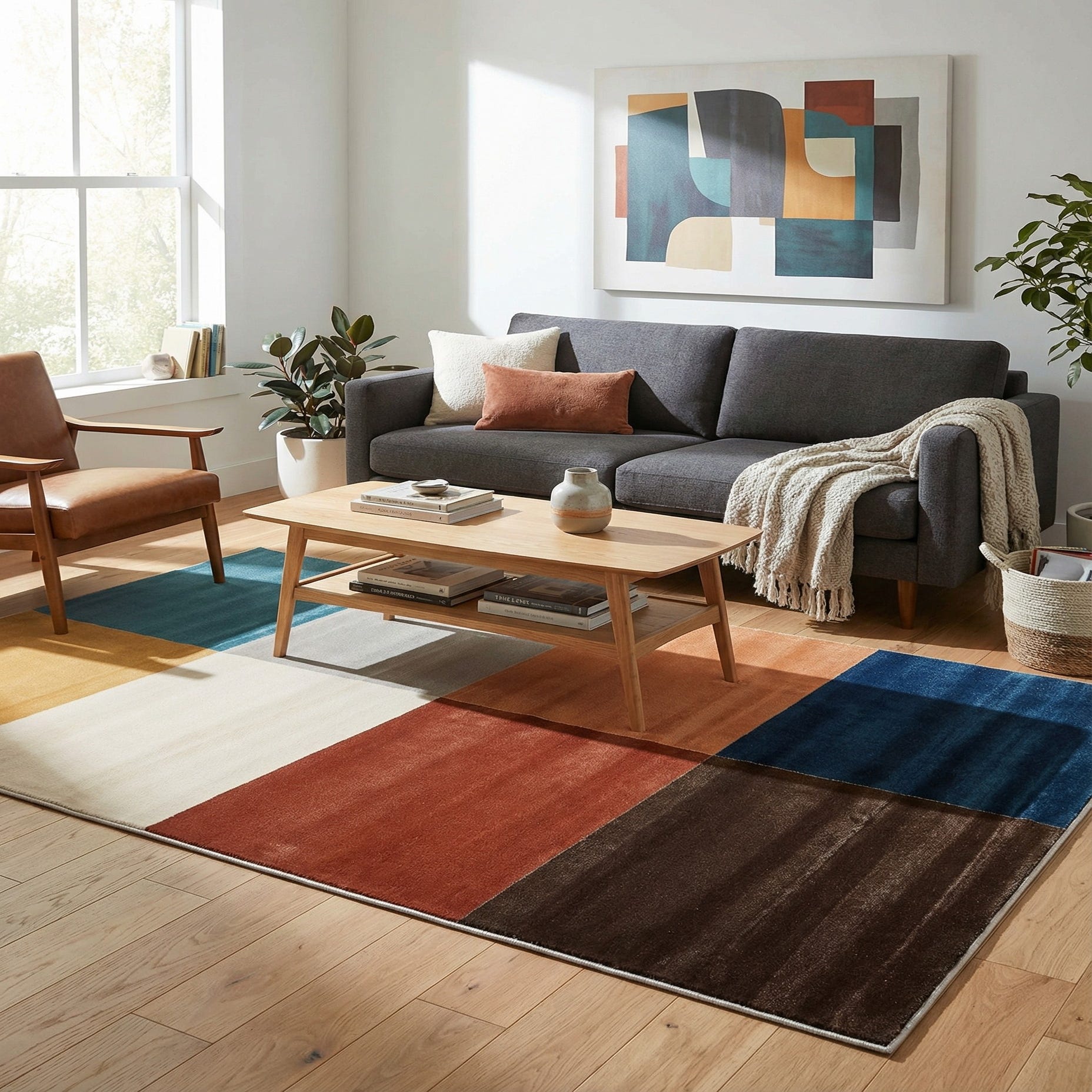 A 5x8 rectangular Gossamer rug featuring a modern color block design with gold, teal, beige, gray, rust, terracotta, brown, and navy sections.