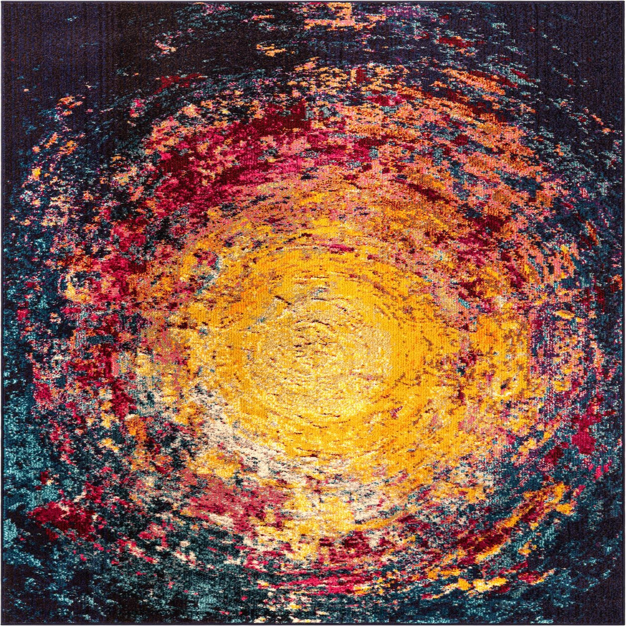 A bold, abstract swirl gives this rug the feel of a painted canvas underfoot. A radiant yellow center ripples outward through layers of peach, pink and puce, while deep blues, light blue and olive weave around the edges against a multi background with beige highlights. The pattern reads as contemporary and artistic, with an almost sunburst or vortex effect that draws the eye and anchors a room.