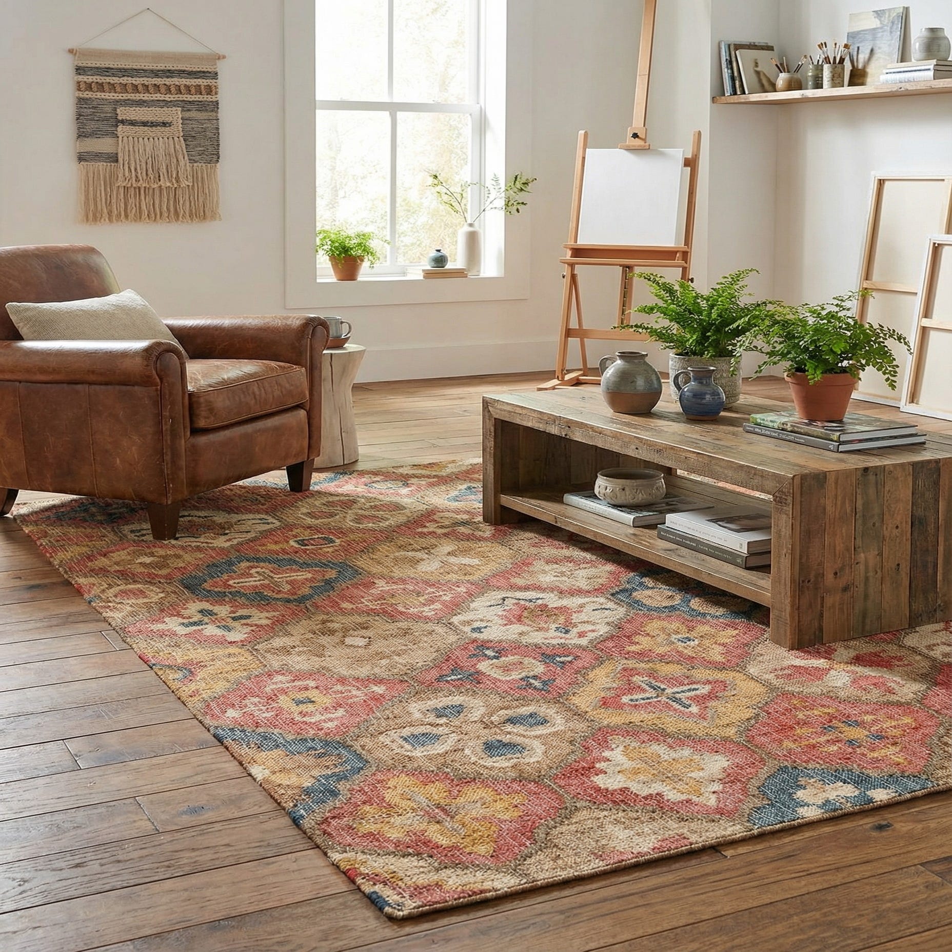 The tactile surface has the pleasant irregularity of handwoven fibers—visible slubs and subtle tonal variation that add depth underfoot. It works well where you want a lived-in, welcoming base: layered in a casual living room beneath a low coffee table, placed in an entry to set a warm tone, or anchored under a dining table with natural wood chairs. The color mix complements warm neutrals, leather and linen upholstery, and mixed-pattern interiors in bohemian, farmhouse, or transitional settings.