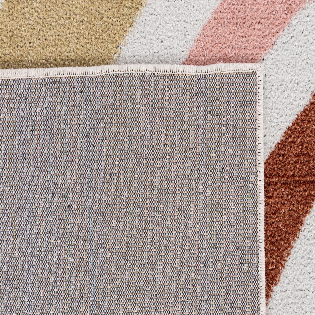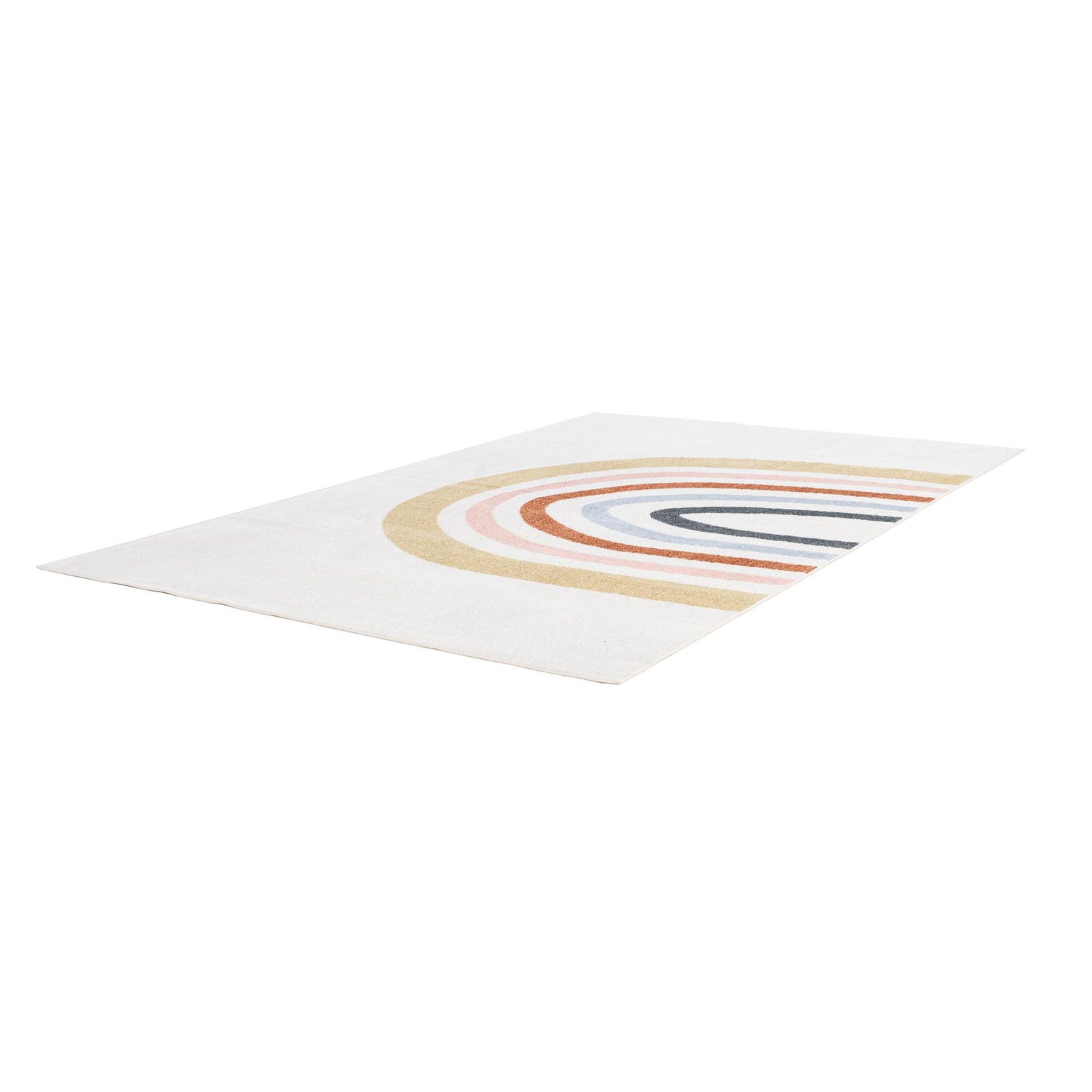 A 5x8 rectangular white rug with a large, abstract, multi-colored rainbow arc in muted tones of gold, pink, brown, light blue, and dark blue.