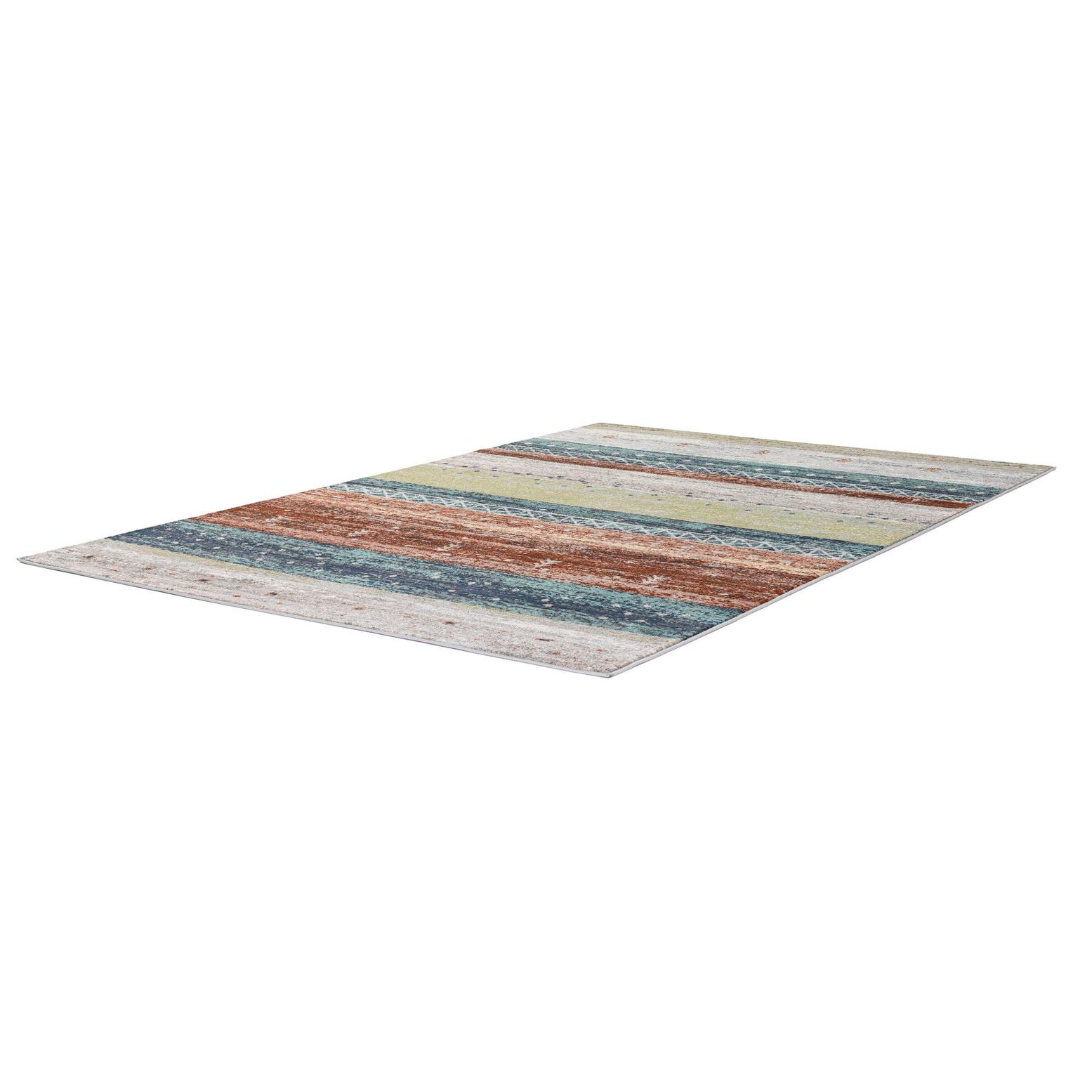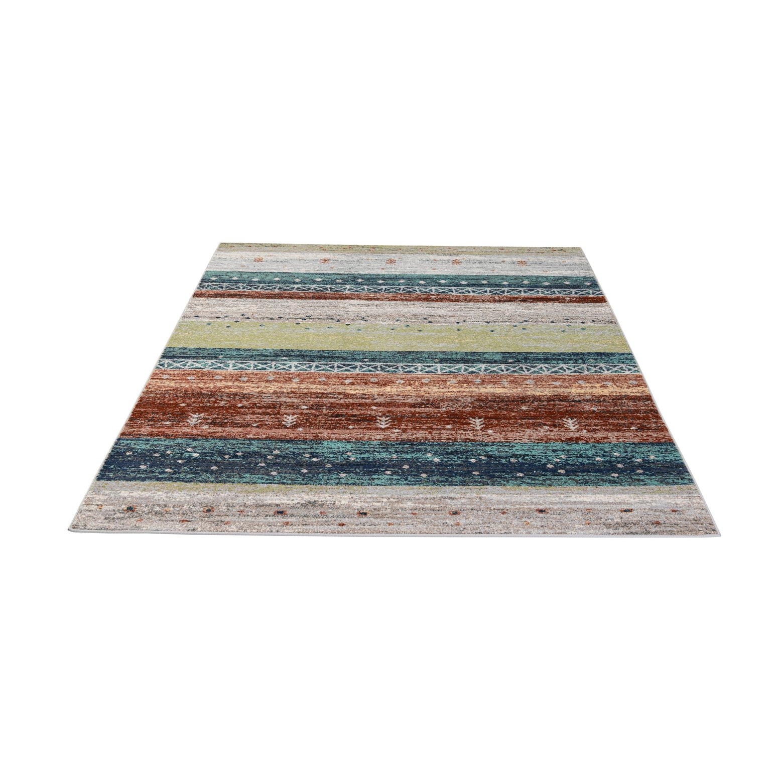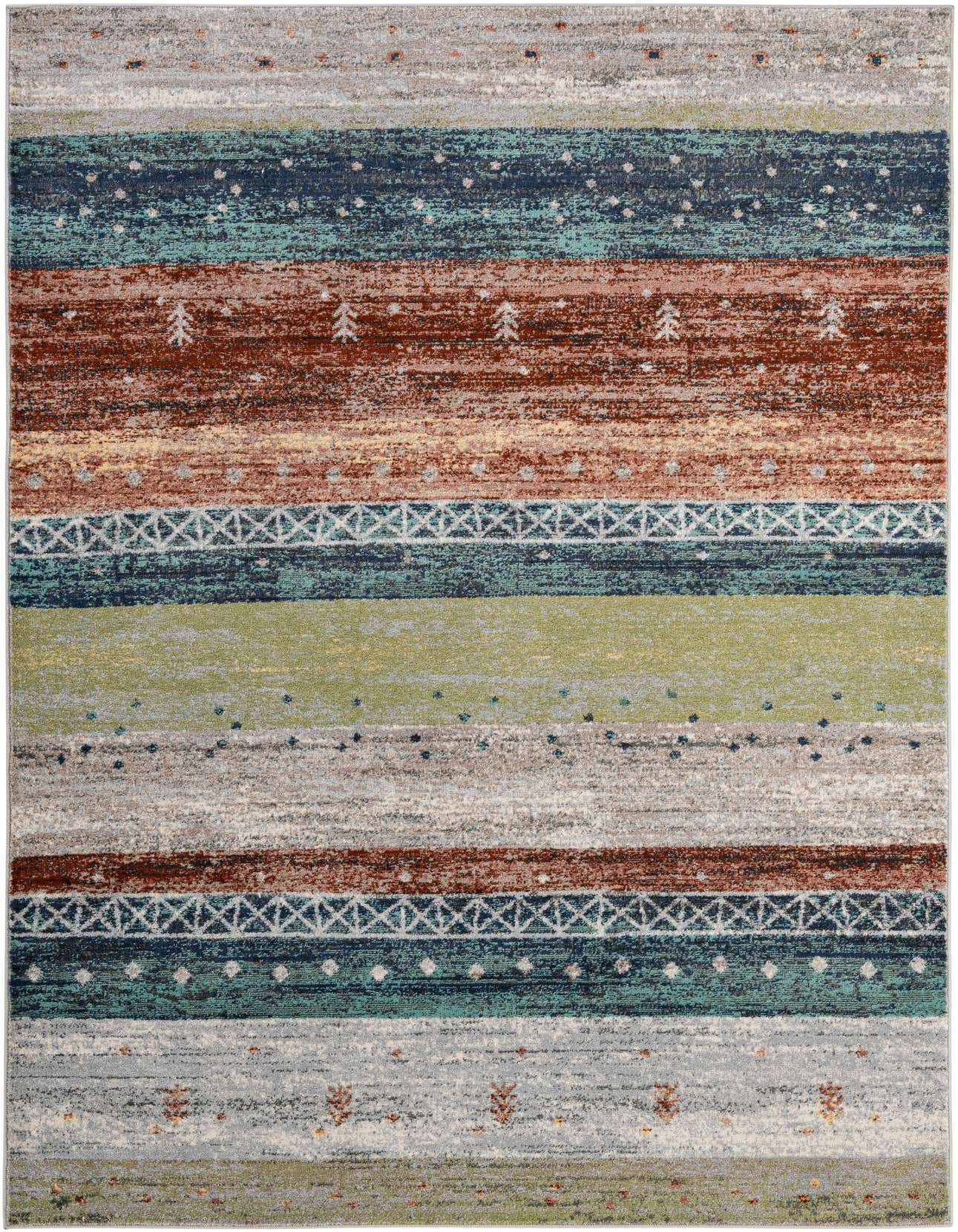 Layered horizontal bands give this rug a relaxed, stripe-driven pattern with a softly distressed finish. Set against a multi background, bands of navy blue and teal alternate with warm rust-red, grassy green, ivory and gray, and are detailed with small geometric dots, lattice crosses and tiny tree and diamond motifs in ivory, navy and red. The palette and irregular, timeworn surface create a casual, handcrafted aesthetic that fits both contemporary and rustic sensibilities.