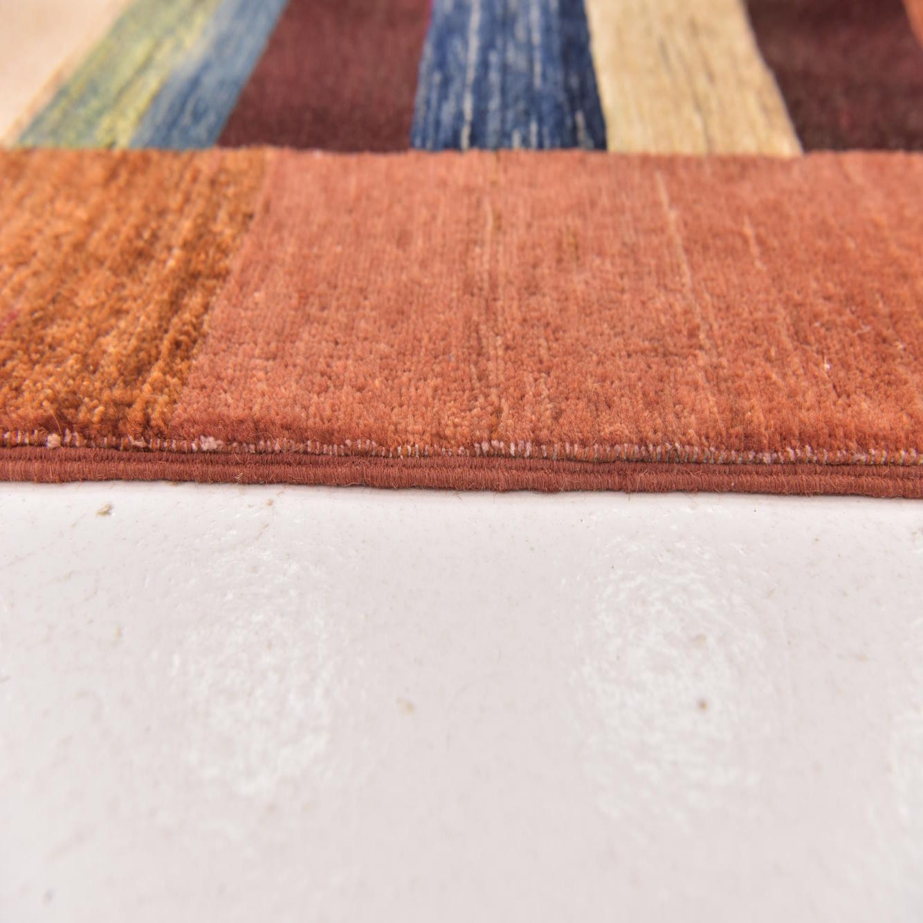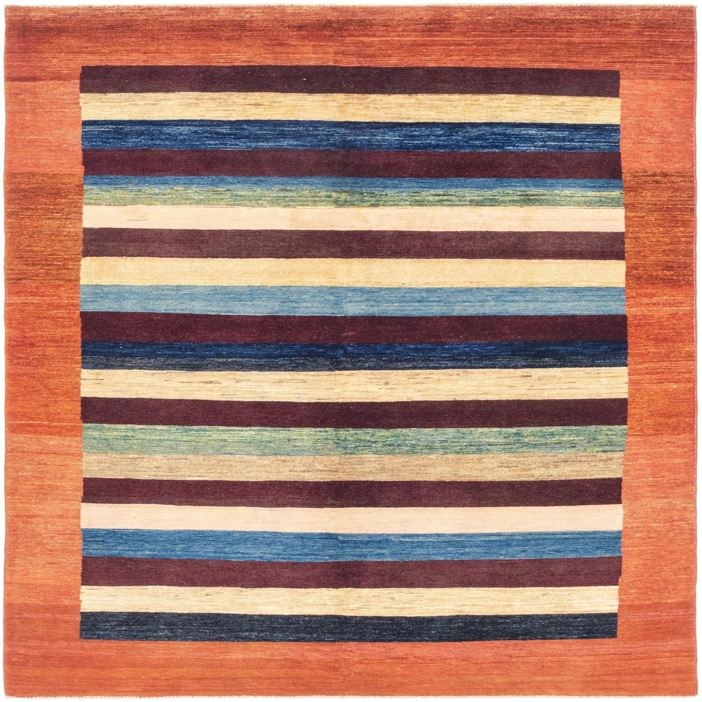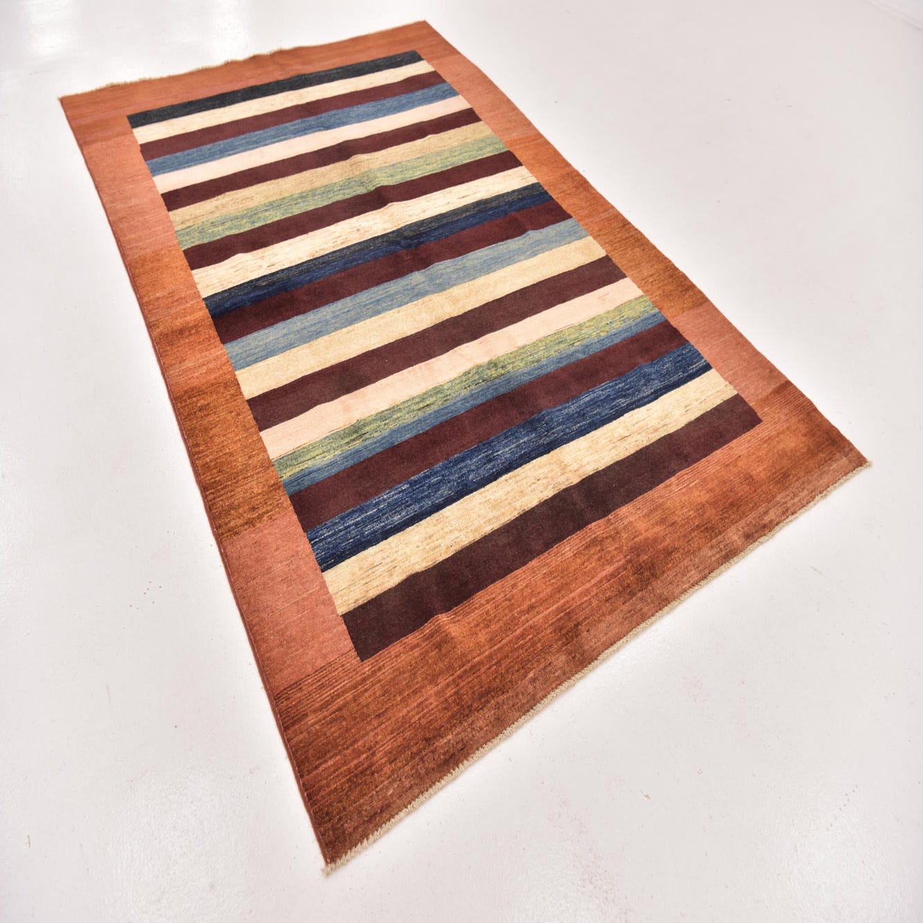 A 5x8 rectangular Kashkuli Gabbeh rug with a multi-colored striped pattern and a solid orange border, suitable for a living room.