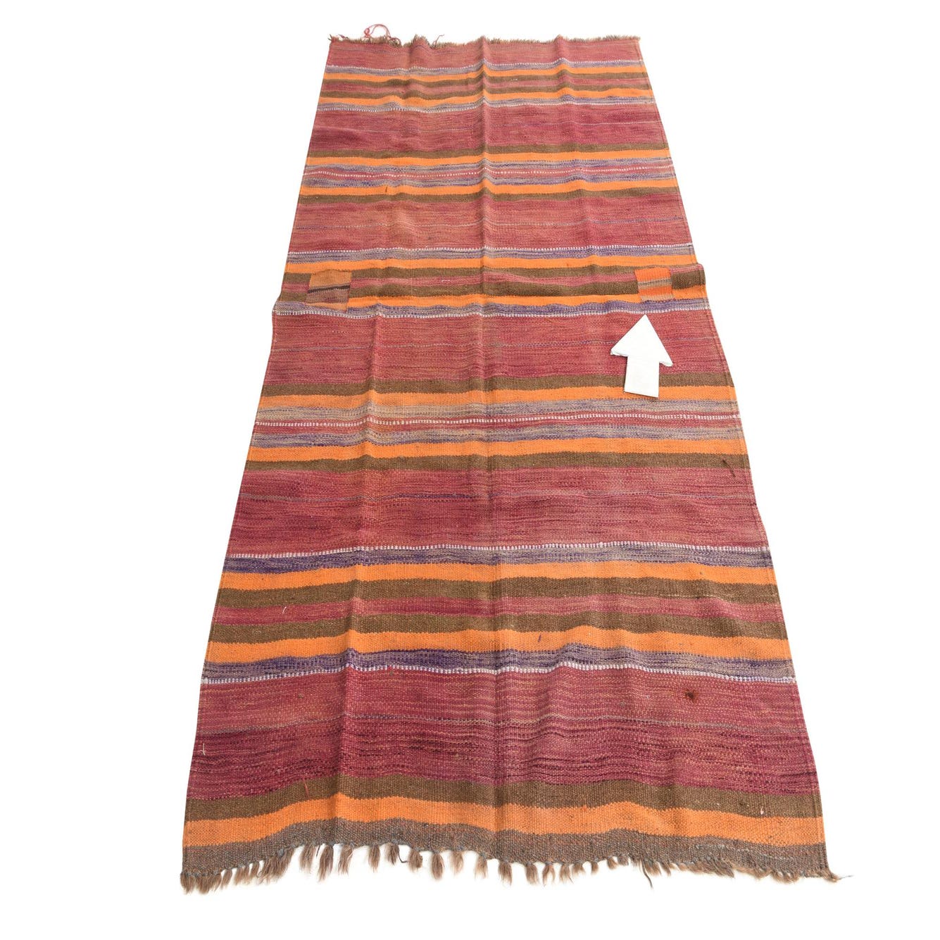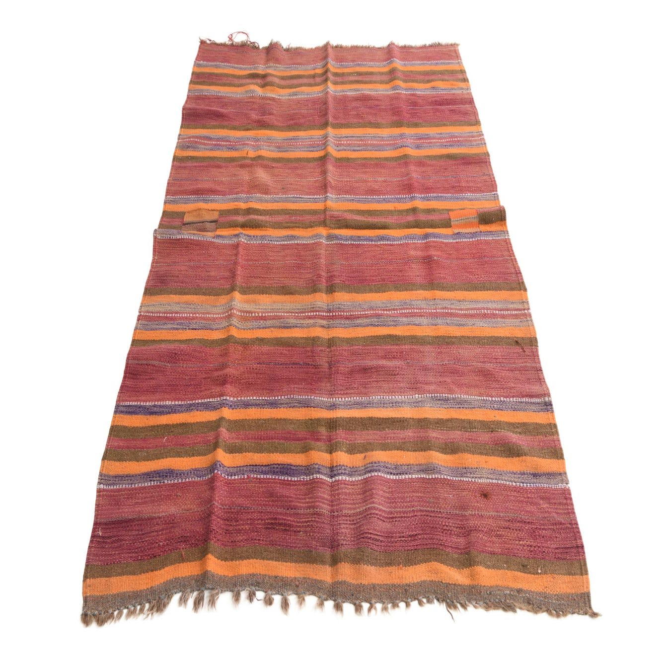This Kilim Fars rug is versatile in its compatibility with various decor styles. It would seamlessly integrate into a bohemian setting, complementing eclectic furnishings and layered textiles. In more minimalistic or modern interiors, this rug can serve as a statement piece, introducing a splash of color and pattern that adds depth and warmth to the space. Its earthy tones and simple design make it equally suited for rustic environments where it can harmonize with natural woods and handcrafted decor. The rug's timeless aesthetic ensures it will enhance living rooms, dining areas, or bedrooms seeking a touch of authenticity and warmth.
