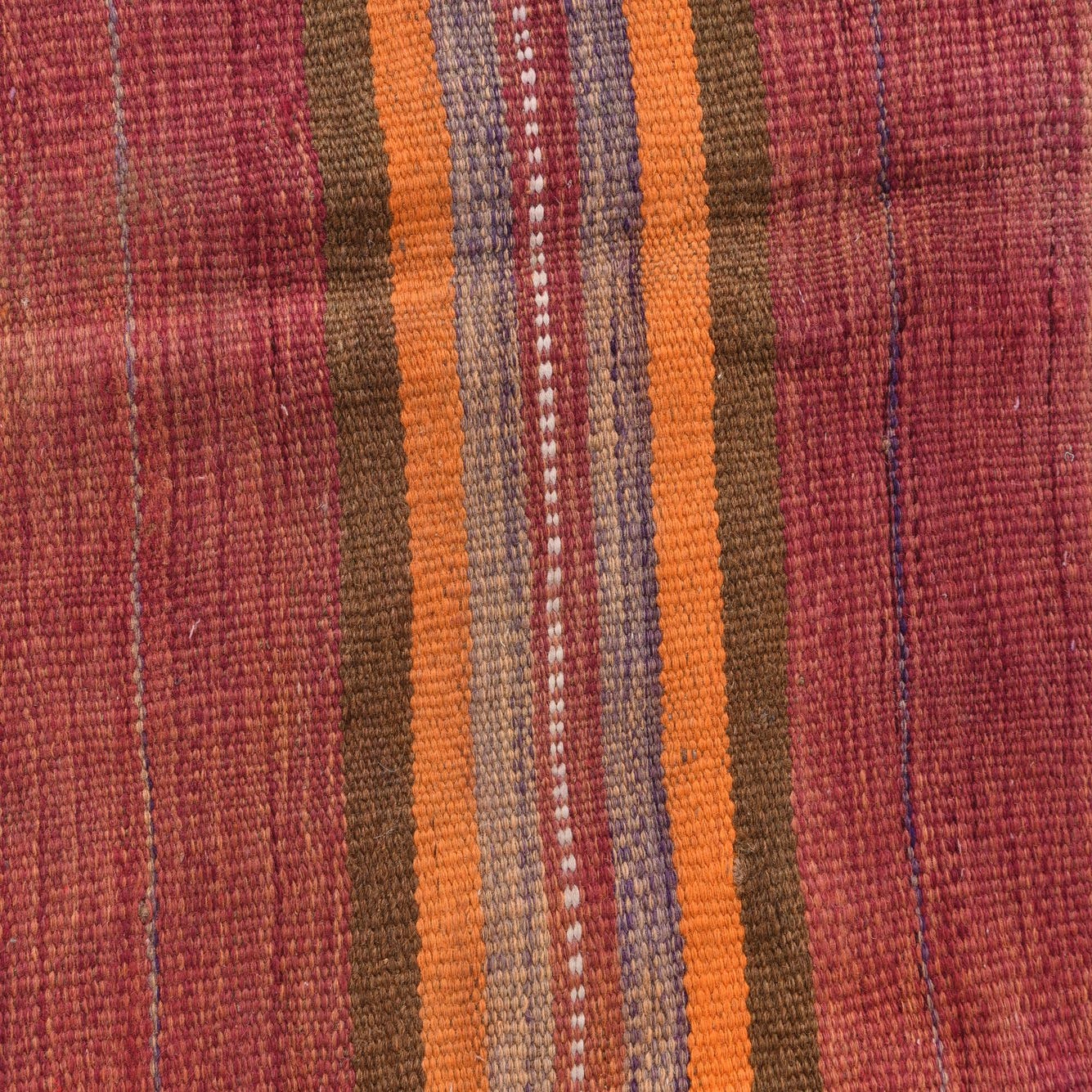 The Kilim Fars collection presents a 5x8 hand-woven rug made of 100% wool, embodying the rich heritage and timeless appeal of traditional craftsmanship. This piece features a warm and diverse color palette, including hues of brown, burgundy, orange, purple, and ivory, all set against a multi-colored background. The rug displays a horizontal striped pattern that offers simplicity and elegance, while the texture of the wool provides a natural and authentic feel underfoot.