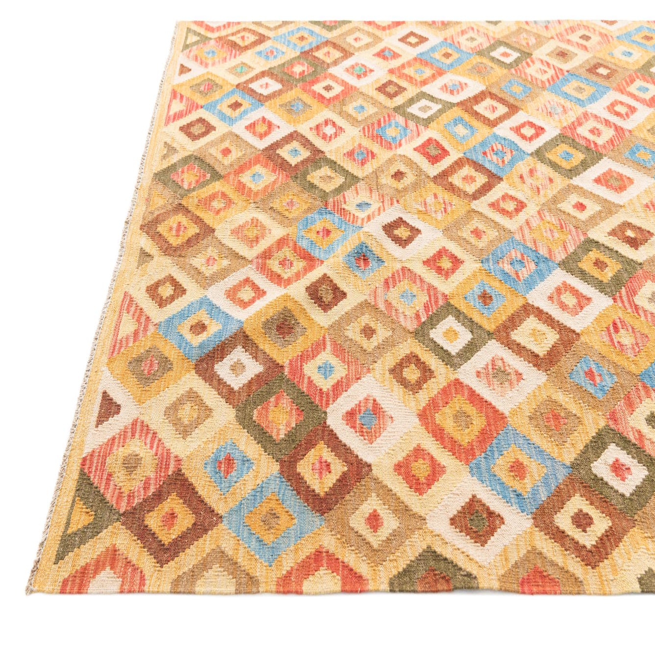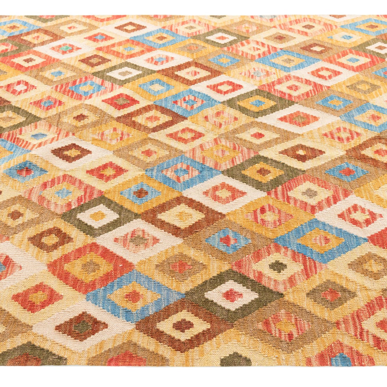 A 5x8 rectangular Kilim Maymana rug with a vibrant, multi-colored geometric diamond pattern on a flatweave wool surface.