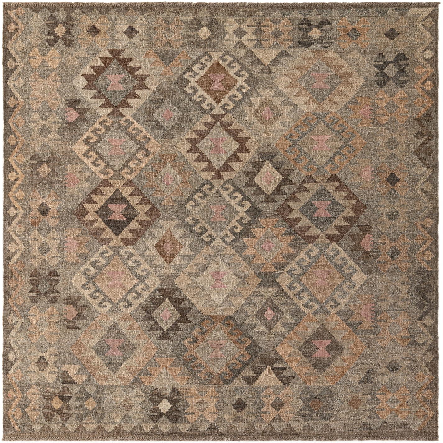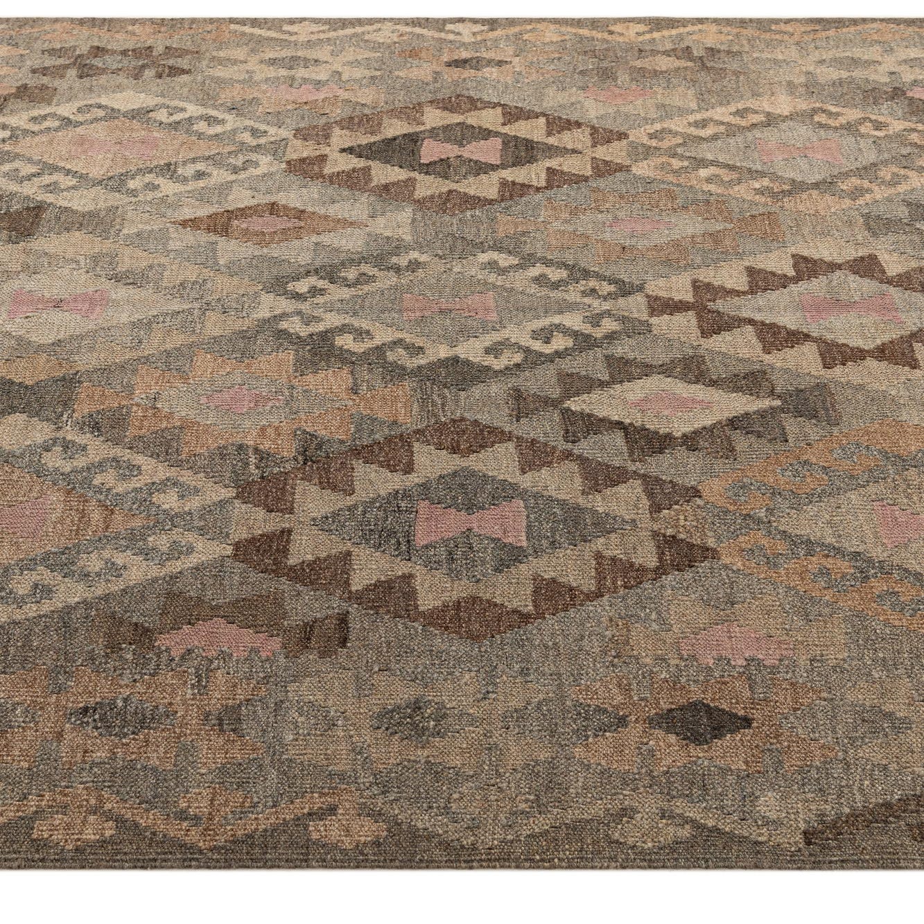 A 5x8 rectangular Kilim Maymana rug featuring a multi-colored tribal diamond pattern in shades of brown, beige, and pink.