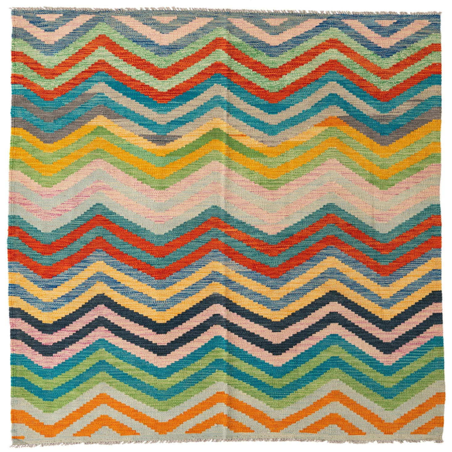 A 5x8 rectangular Kilim Modern rug with a vibrant multi-colored chevron pattern, featuring shades of orange, blue, green, yellow, and pink.