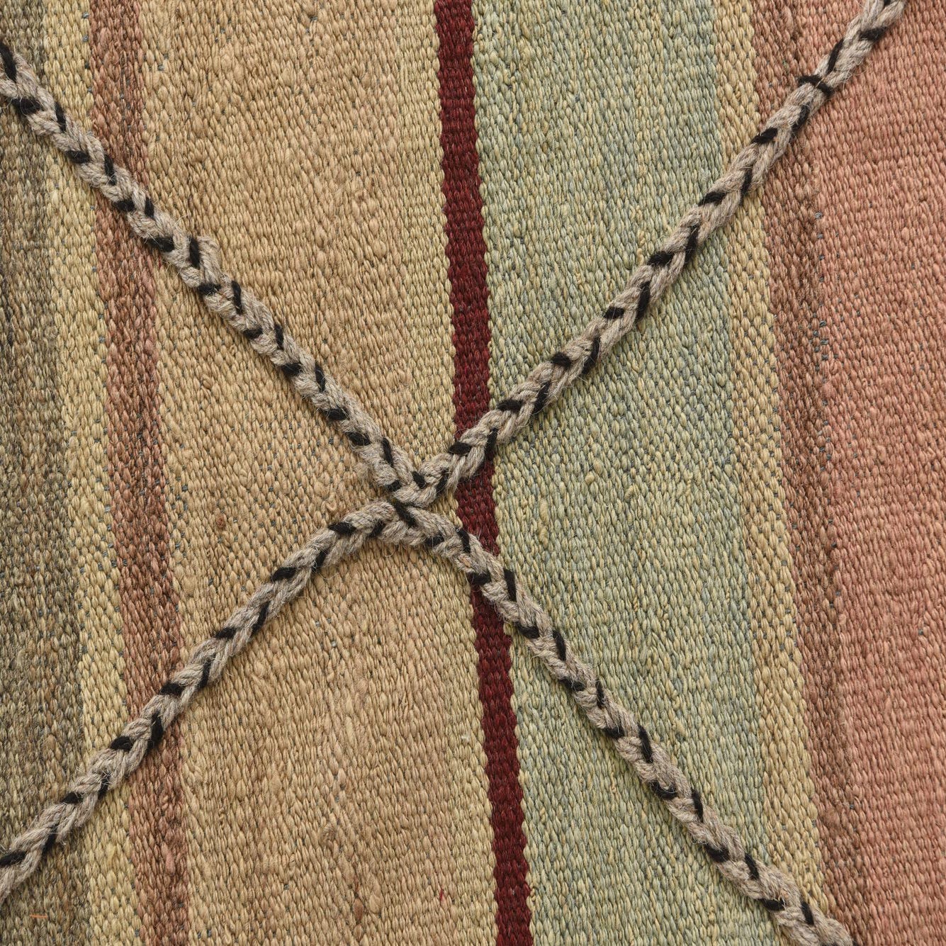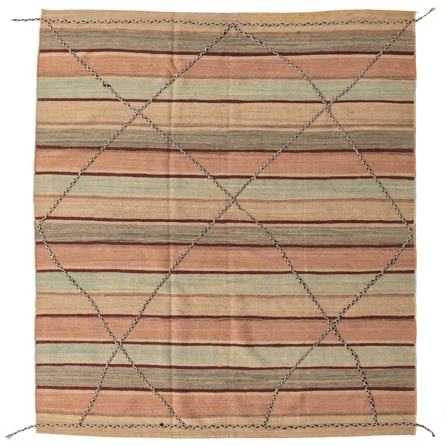 A 5x8 rectangular flatweave rug with horizontal stripes in peach, beige, light blue, and burgundy, overlaid with a braided diamond pattern.