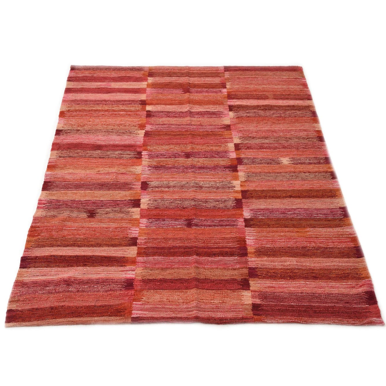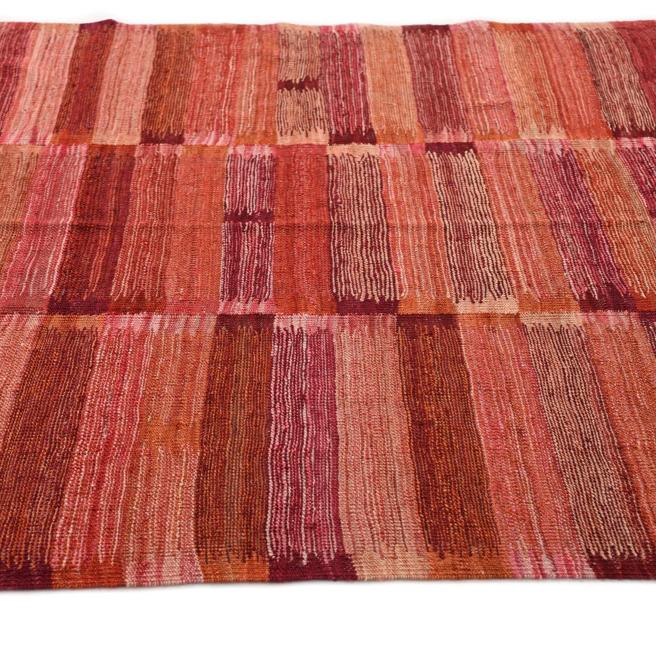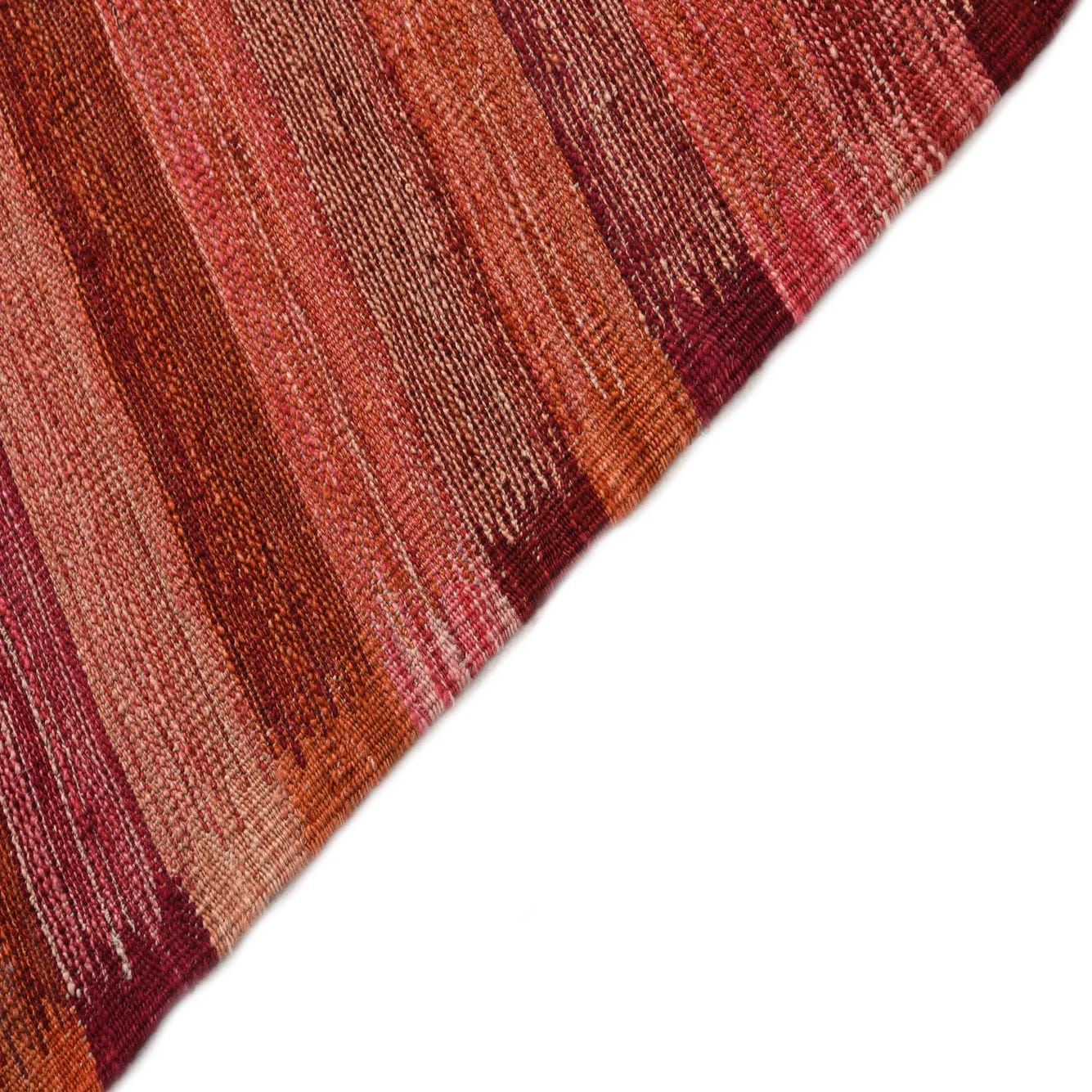 A 5x8 rectangular flatweave rug with horizontal stripes in various shades of red, orange, and pink, featuring a tribal, modern, and oriental pattern.