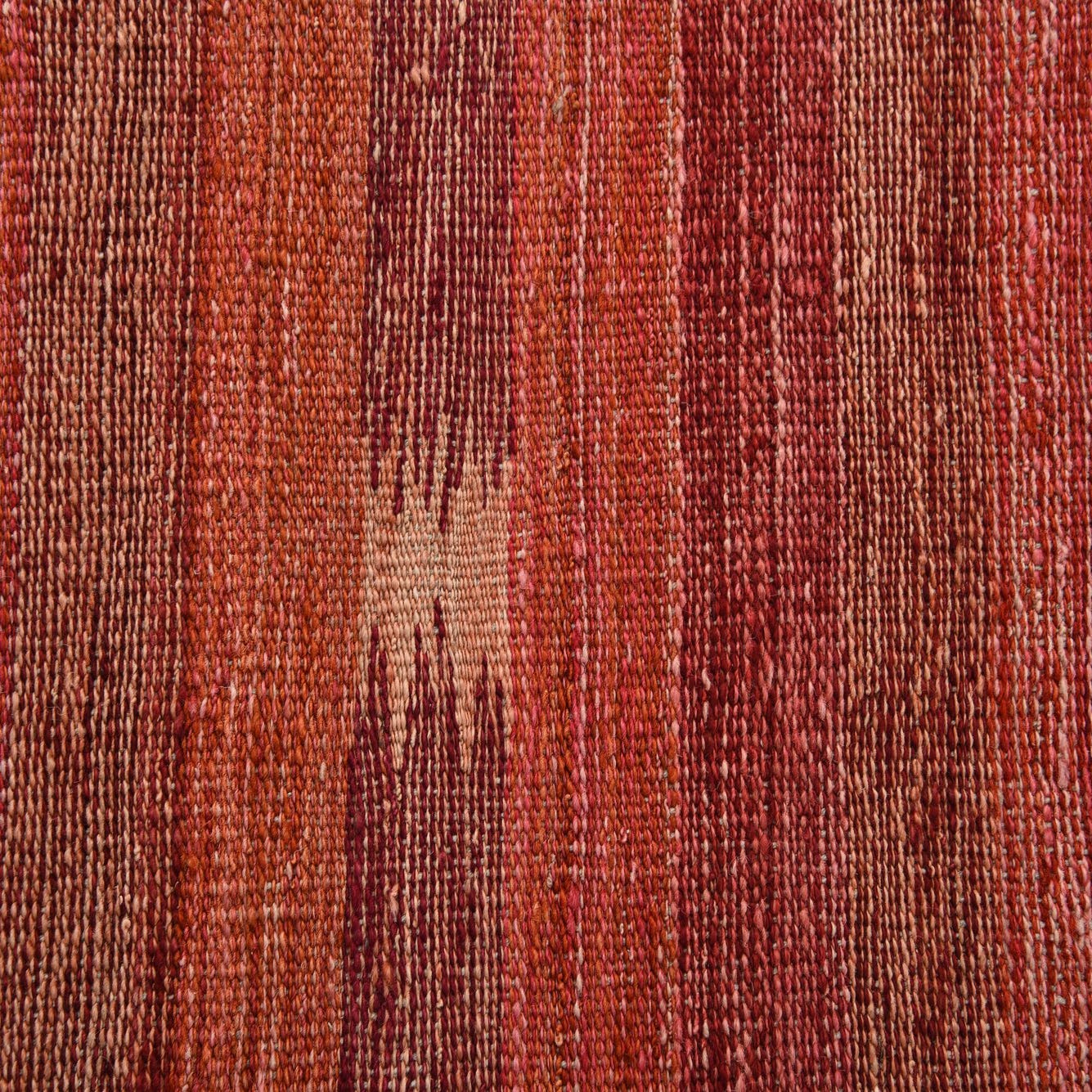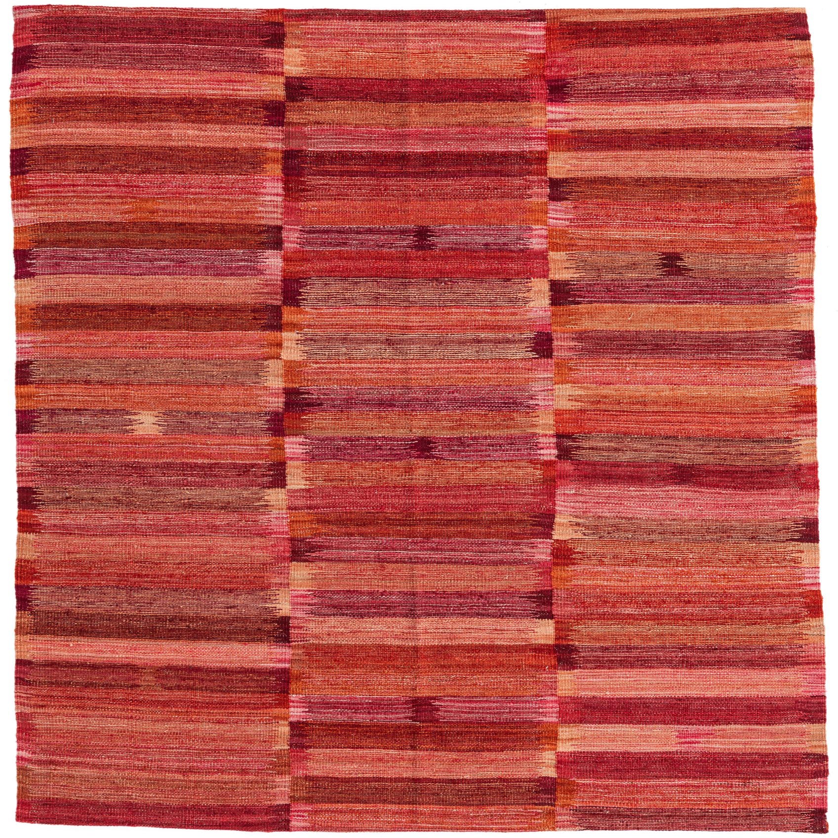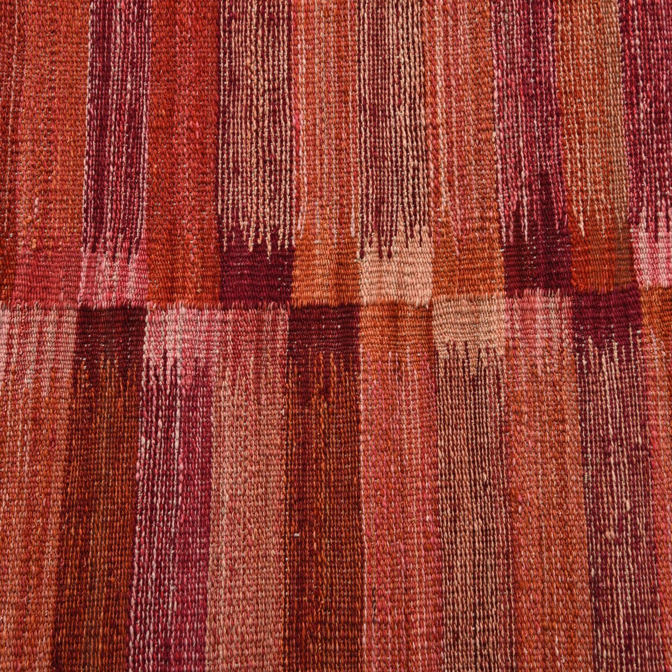 A 5x8 rectangular flatweave rug with horizontal stripes in various shades of red, orange, and pink, featuring a tribal, modern, and oriental pattern.