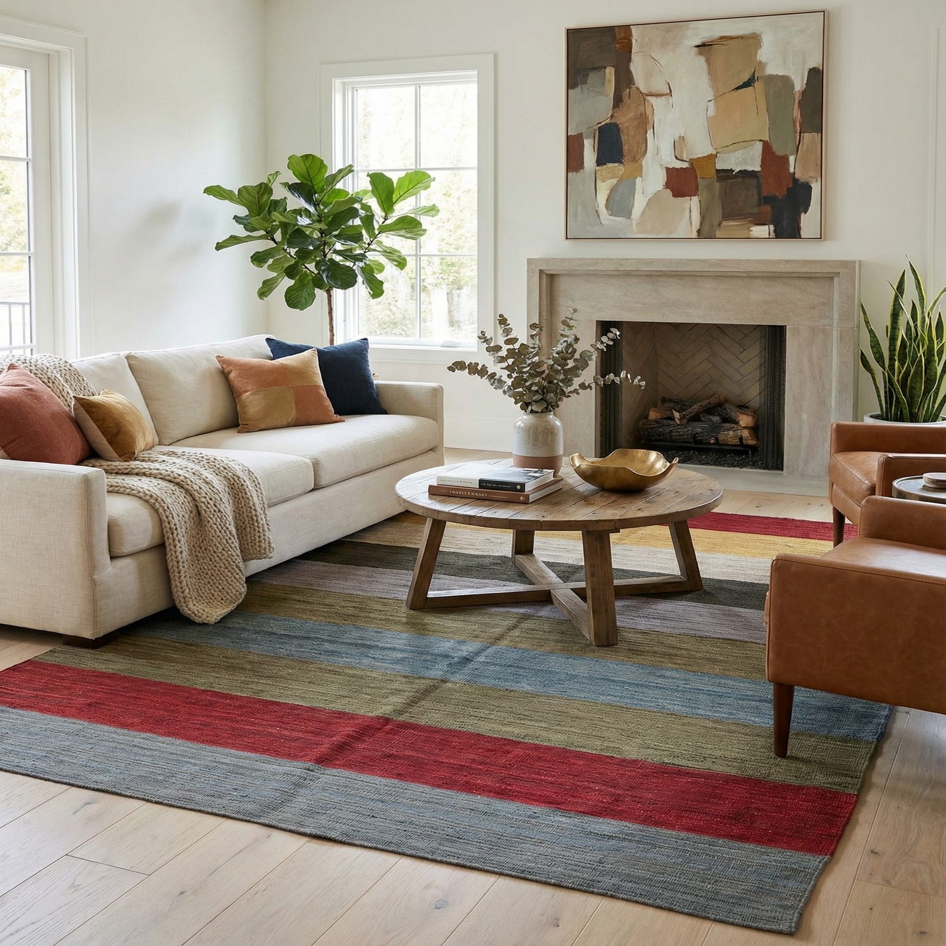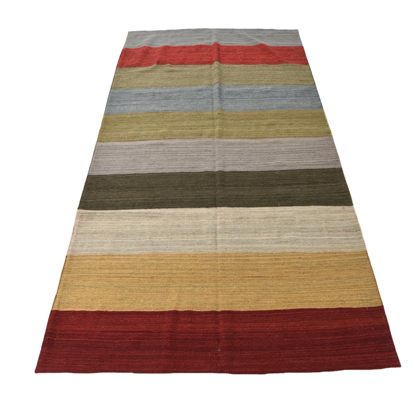 A 5x8 rectangular Kilim Modern rug featuring horizontal stripes in red, gold, grey, olive, and blue.