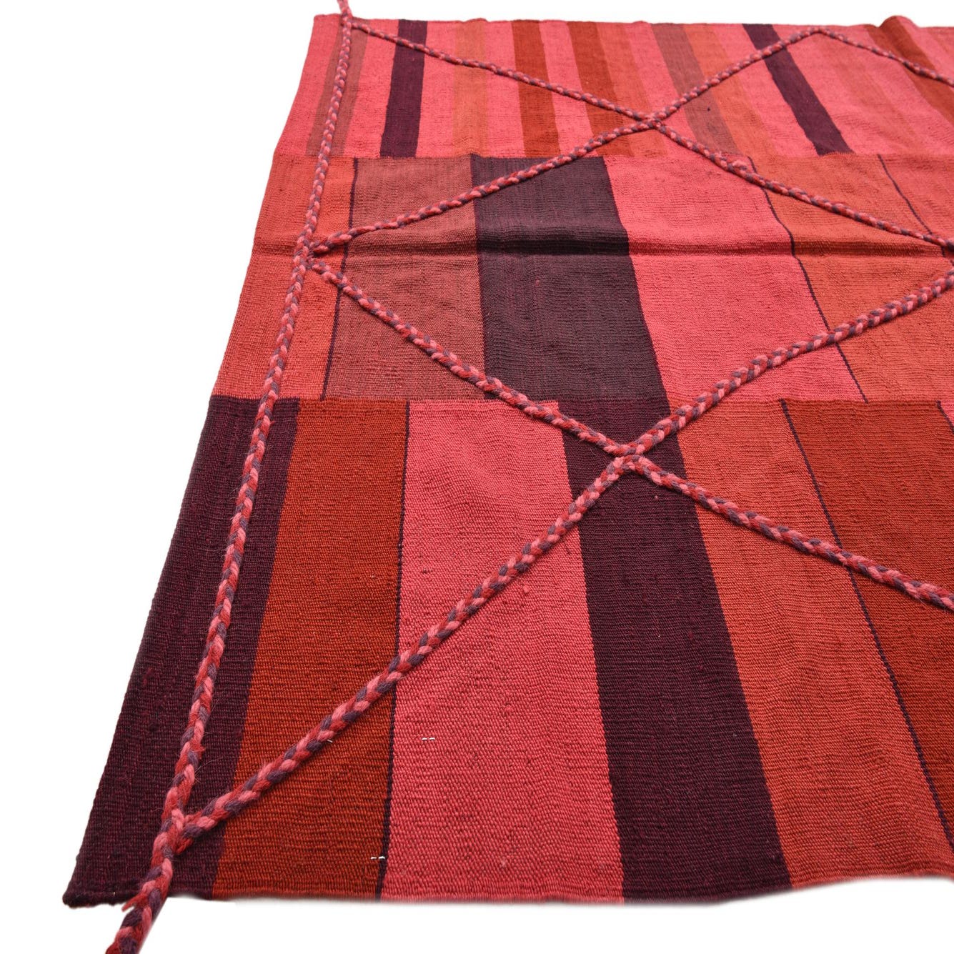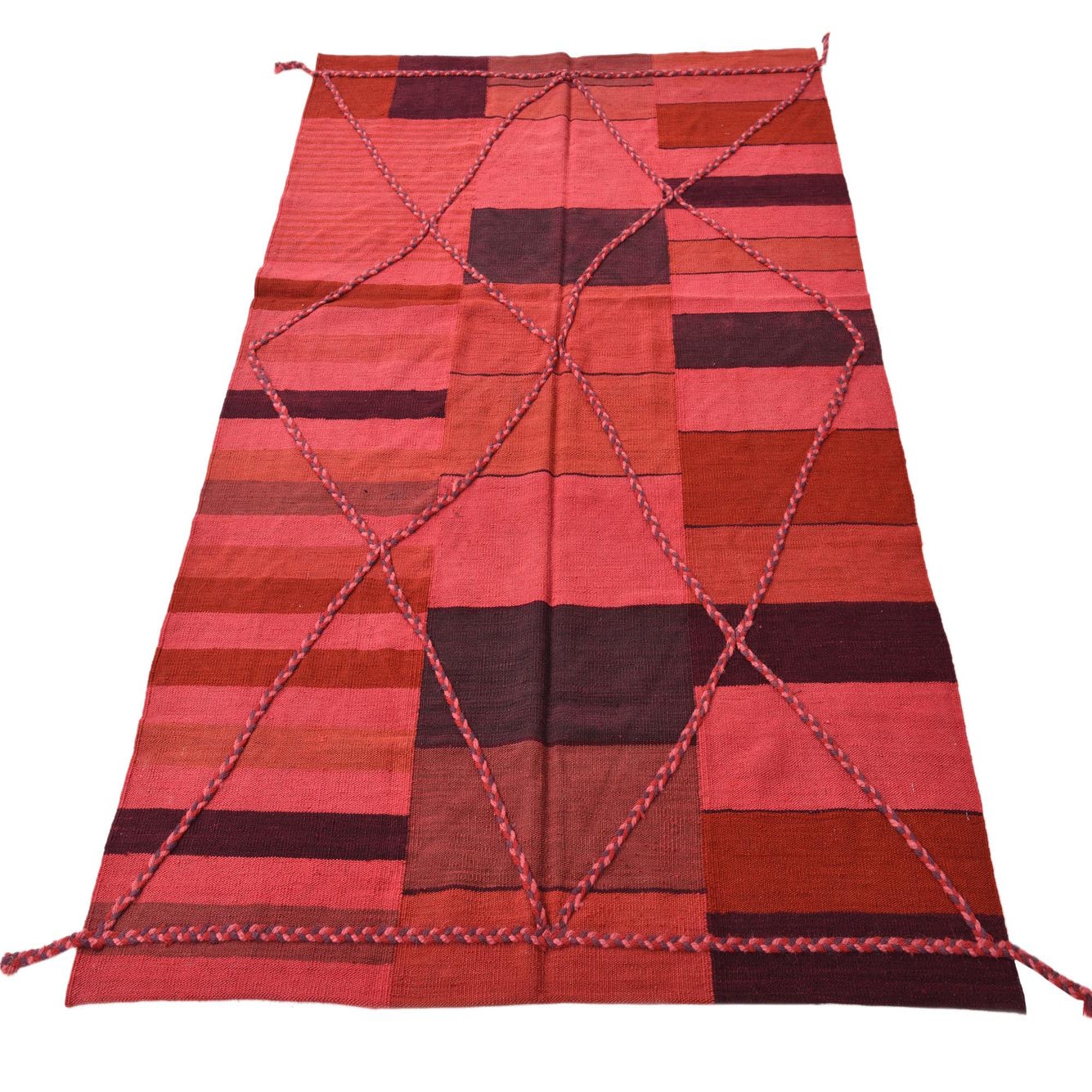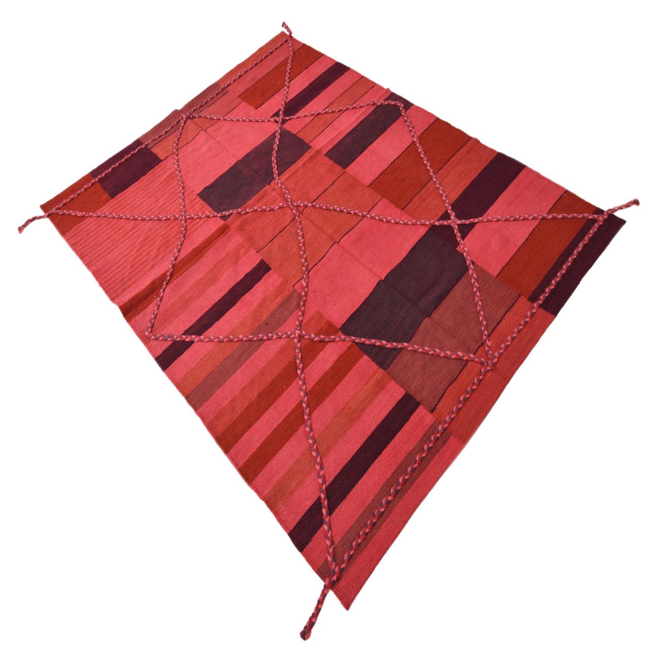 The Kilim Modern collection presents a hand-woven rug crafted from 100% wool, offering both durability and tactile appeal. This 5x8 piece features a dynamic pattern that embodies a contemporary take on traditional kilim design, blending geometric shapes and bold lines to create an engaging visual effect. The color palette includes rich hues of burgundy, red, purple, and pink set against a multi-colored background, providing a vibrant yet balanced combination suitable for a range of interior spaces.